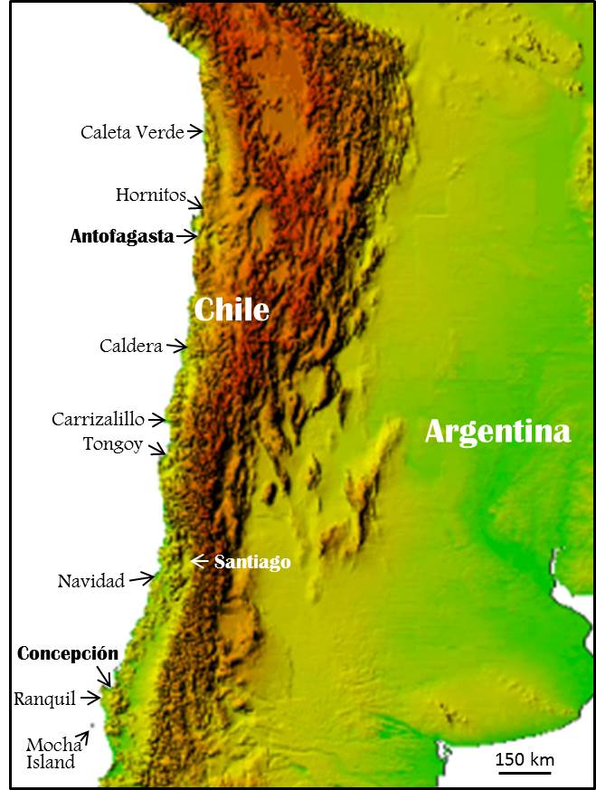 Ortlieb, L.; Zazo, C.; Goy, J.; Hillaire-Marcel, C.; Ghaleb, B.; Cournoyer, L. 1996. Coastal deformation and sea-level changes in the northern Chile subduction area (38°S) during the last 330 ka. Quaternary Science Reviews 15: 819-831.