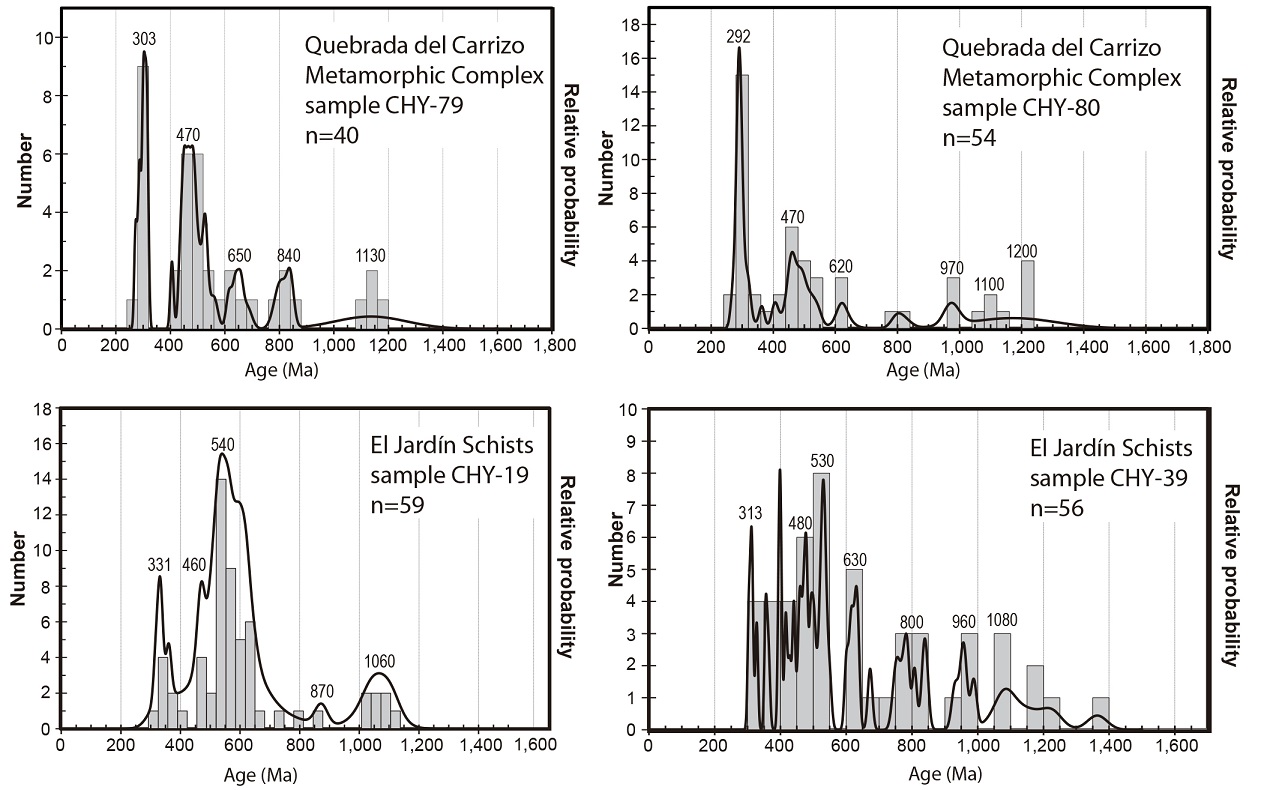 The results of U-Pb dating of detrital zircons from four samples of mica schists are comparable to each other, as they show significant concentrations of U-Pb ages in the range of 400-600 Ma (Early Devonian to Late Proterozoic), which constitute the largest population in 3 of the samples, and define graphical relative probability peaks at 470 Ma for the zircon grains from the Quebrada del Carrizo and peaks at 460 and 480 Ma for those from El Jardín Schists (Fig. 10); the later also include higher peaks at 530-540 Ma (Fig. 10) with an ill-defined bimodal population. The four analyzed samples include youngest population of Late Paleozoic zircons, which are of ~269-321 Ma for Quebrada del Carrizo and of ~304-336 Ma for El Jardín Schists. Besides, the four samples include significant concentrations of U-Pb ages from 1,000 to 1,200 Ma, plus less prominent peaks centered at about 800 and 620-650. The overall coincidence of zircon grain age populations indicates a common provenance of the sedimentary material of the protolith of the mica schists of Quebrada del Carrizo Metamorphic Complex and El Jardín Schists.
