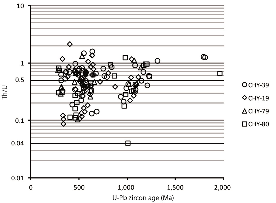 Most of the analyzed zircon grains from the schists show regular internal zonation pattern characteristic of a magmatic origin (Corfu et al., 2003) (Fig. 6) and 50% of the zircon grains have Th/U ratio values >0.5, which are consistent with composition of igneous zircons according to Hoskin and Schaltegger (2003). The complete Th/U ratio ranges from 0.04 to 2.15 (Fig. 11), so that near half of zircon grains cannot be unambiguously classified by their Th/U ratio (Fig. 11), but only two zircon grains have Th/U ratio of 0.04 that is consistent with metamorphic-melt zircon composition (Hoskin and Schaltegger, 2003), and these are of zircon grains that yielded Proterozoic U-Pb ages of 1,005 and 2,409 Ma, respectively.