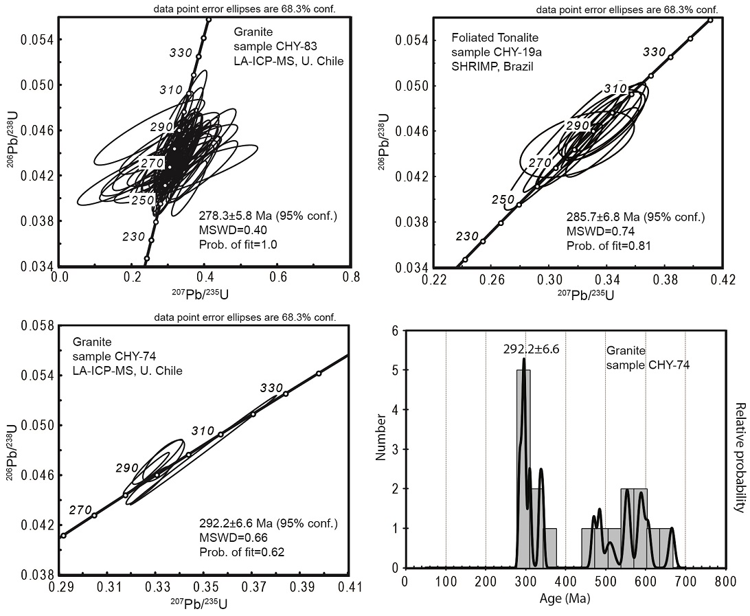 The U-Pb zircon ages obtained for intrusive rocks emplaced within the schists are of 278.3 ± 5.8 Ma for granite (CHY-83) of the del Carrizo creek and of 285.7±6. 8 for foliated tonalite (CHY-19a) of the Jardín creek (Fig. 12). A granite injection (CHY-74) within a fold hinge in the El Jardín Schists contains a group of inherited Neoproterozoic to Cambrian zircon grains (Fig. 12) that is analogous to the prominent maxima of U-Pb ages of the metamorphic rocks, thus probably incorporated from them. The youngest peak (5 spot analyses) defines a mean U-Pb age of 292.2 ± 6.6 Ma for the granite (Fig. 12), which coincides within error limits with the age obtained for the foliated tonalite in the same area.