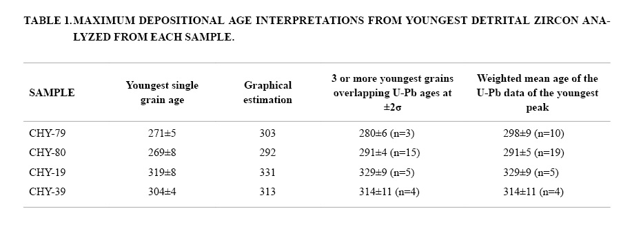 The maximum depositional age estimates of table 1 consistently correspond to Late Carboniferous for the El Jardín Schists and Early Permian for the Quebrada del Carrizo Metamorphic Complex; 314±11 Ma and 291±5 Ma, respectively, if the youngest most statistically robust values of table 1 are considered.