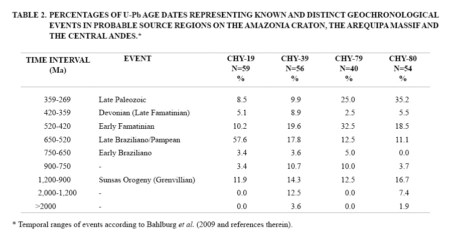 The concentrations of detrital-zircon U-Pb ages within 400 and 600 Ma indicate significant detritus input from eastern sources including the Brazilian and Pampean Orogenies and the Ordovician to Silurian Famatinian magmatic arc of northwestern Argentina. Other concentrations of detrital-zircon U-Pb ages from 900 to 1,200 Ma are reflecting input from Sunsas (Grenville) age magmatic rocks, while only scarce U-Pb ages older than 1200 Ma occur and these may correspond to a minor input of zircon grains from South American cratonic areas. Grains of Devonian age are scarce in the analyzed zircon populations, consistent with a passive margin and lull of magmatic activity during this period on the paleo-Pacific border of Gondwana.