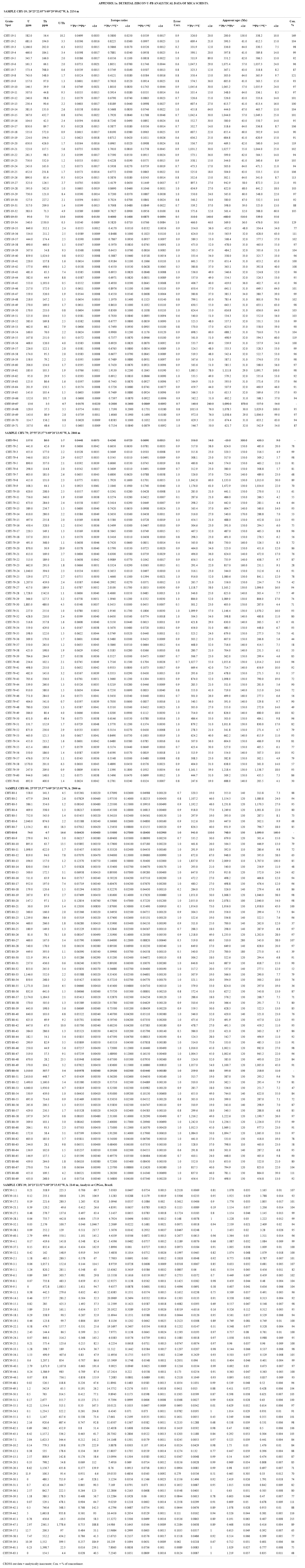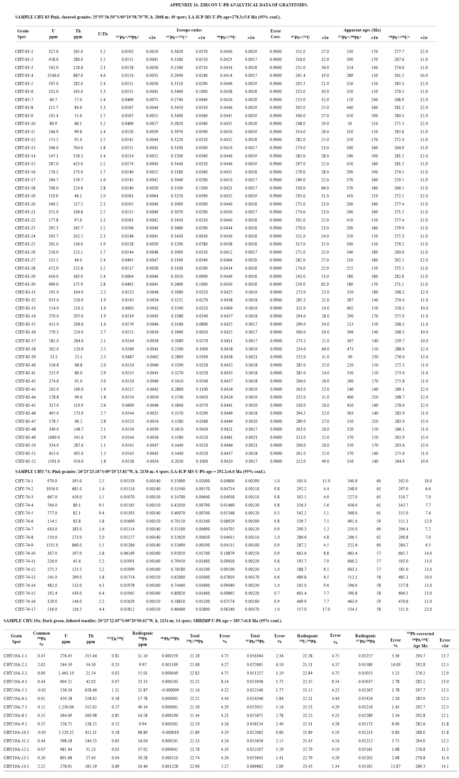 U-Pb analyses for sample CHY-39 were also performed by the Laser Ablation Inductively Coupled Plasma Mass Spectrometry (LA-ICP-MS) with a high-resolution, multiple collector mass spectrometer with a plasma source (MC-ICP-MS; Finnigan, Neptune), connected to an Excimer ArF laser (λ=193 nm) in the Geochronological Research Center (Centro de Pesquisas Geocronológicas) of the Sao Paulo University in Brazil. The ablated material was carried by Ar (~7 l/min), and He (~0.6 l/min) in analyses of 60 cycles of 1 second. The measure sequence among standard, blank and unknown was: 2 blanks, 3 standards, 13 unknowns, 2 blanks and 2 standards All analyses were conducted in static mode with a laser beam diameter of ~29 μm , operated with an output energy of 6 mJ and a pulse rate of 6 Hz. Normalization was carried out using Temora standard zircon (416.75±0.24 Ma, 95% confidence limits; Black et al., 2003) and age calculation were performed using ISOPLOT V3 (Ludwig, 2003). Corrections for common Pb were applied to samples with 206Pb/204Pb lower than 1000, using Stacey and Kramers (1975) model at the age of crystallization and for polarization displacement. U-Pb data were plotted using ISOPLOT V3 (Ludwig, 2003). Errors for isotopic ratios are presented at ± 1σ level in Appendix 1a and 1b.