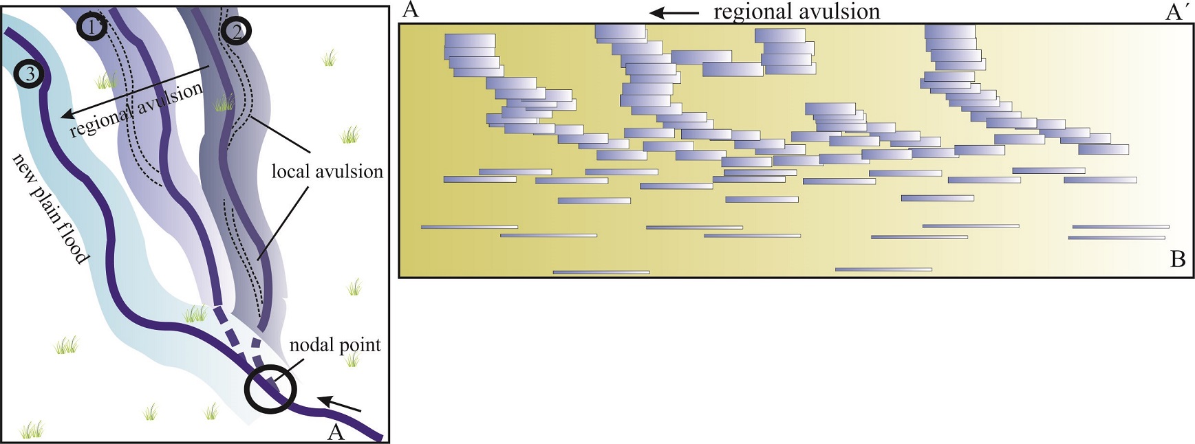 Fig. 7. A. Terminal fan model of Candeleros Formation; B. The lateral design between channels and overflow deposits. The system design will result in a gradational stratigraphic style avulsion.