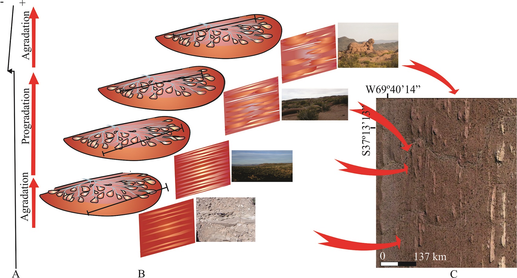 Fig. 9. A. Accommodation curve for each of the sections of the Candeleros Formation; B. Model of terminal fan adapted from Kelly and Olsen (1993) and Hampton and Horton (2007). Transects identified in the plan view with a straight and vertical panels; C. Satellite image of the workspace. The arrows indicate the correspondence with each of the schemes.