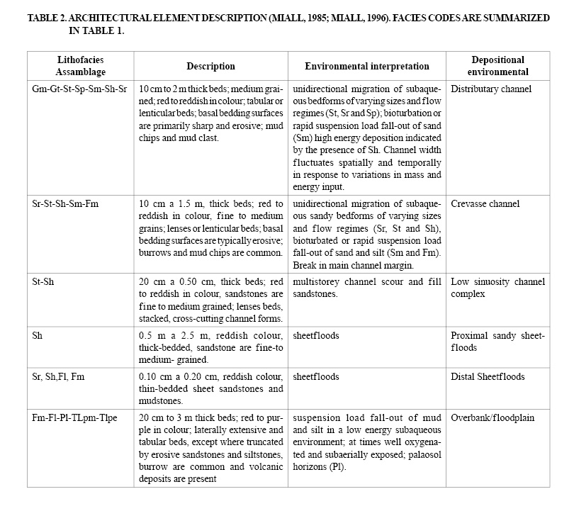 The outcrops in this study (Fig. 1) represent both types of a terminal fan basin margin, and were selected based on the quality and continuity of exposure, abundance of sandstone, accessibility, and their potential for expanded, detailed studies. The methods used for the collection and analysis of data from the Candeleros Formation in the west-central Neuquén Basin follow a stratigraphic and sedimentological approach: a survey of 3 sections over 15 km with identification of the different integrating sedimentary units (Figs. 1a and c). Facies analysis and mapping was completed on photomosaic outcrop maps. This technique was used to define lithosomes and their bounding surfaces. We identified the lithology, sedimentary structures (Table 1), geometry of the deposits and paleocurrent data, which were then analyzed statistically. Also, extensive outcrops were photographed in order to identify and document any architectural elements (Table 2) present in accordance with the methodology proposed by Miall (1985). In addition, we carried out an integrated profile development at a scale of approximately 1:20 (Fig. 2) in order to provide detailed documentation of the facies profiles. Their identification and interpretation, together with the analysis of associations and architectural elements at meso-macro scale allowed the identification of processes involved in the development of the terminal fan units.
