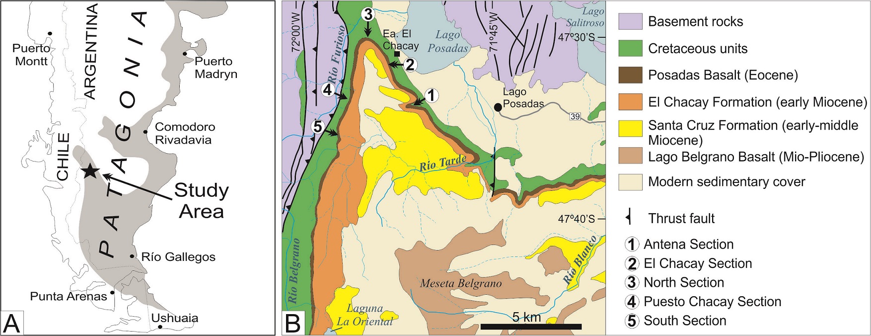 We use the term El Chacay Formation for the “Patagoniense” marine deposits of Lago Posadas-Meseta Belgrano, following the proposal of Chiesa and Camacho (1995), who described these deposits in the same area studied in this work. Other previous litostratigraphic proposals exist for adjacent regions (e.g., Guadal Formation, Niemeyer et al., 1984). However, it is not the objective of our work to discuss the validity of each of the abundant formal lithostratigraphic proposals available in the literature. Additional work on lithologic description and stratigraphic context is needed in some other regions of southern Patagonia in order to propose an integrated litostratigraphic scheme that may satisfy all cases. The reader is referred to Camacho (1967), Riggi (1979a, 1979b) and Malumián et al. (1999) for further discussion about this long-lived topic.