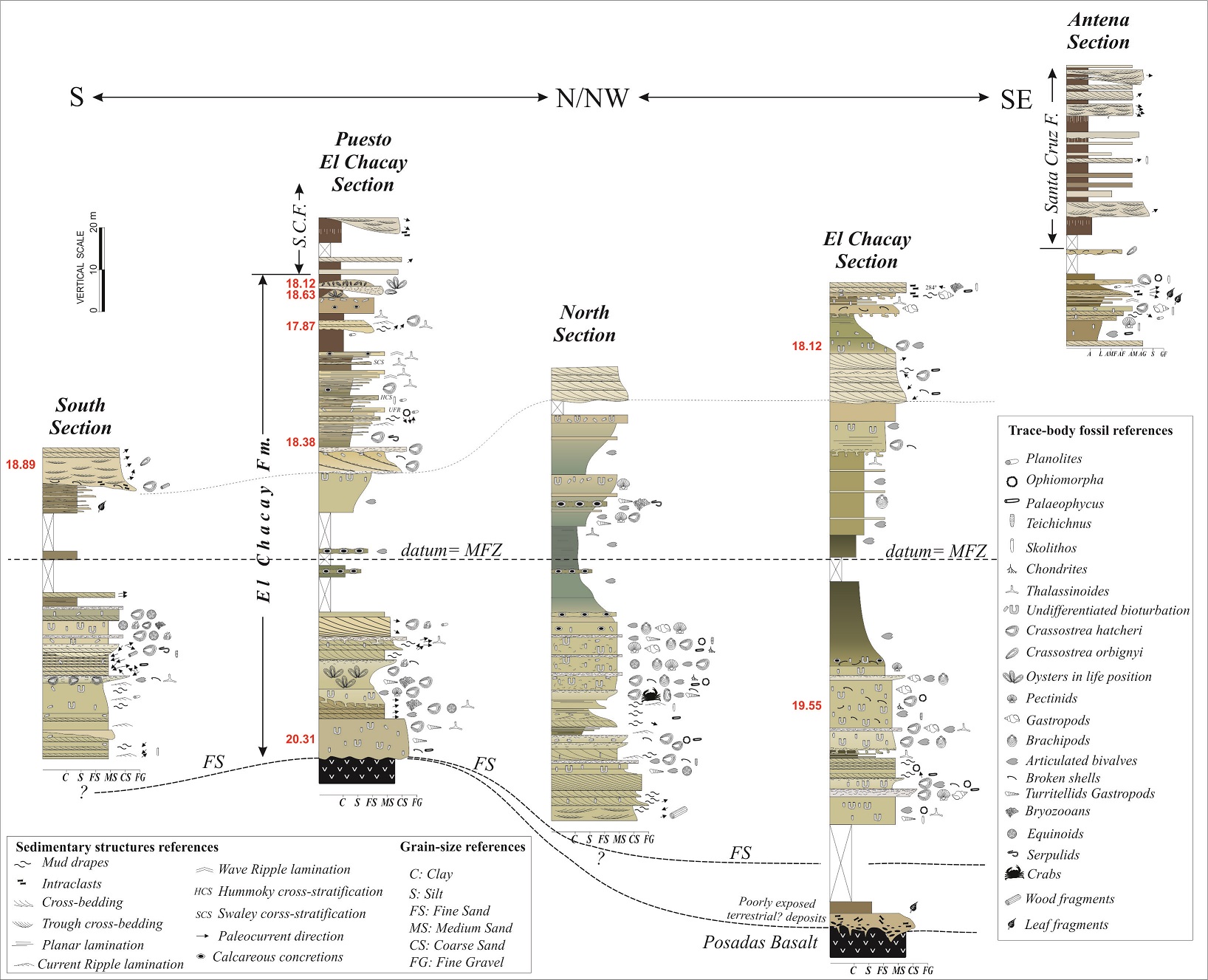 Age data immediately above the Posadas Basalt yielded 20.31 Ma and represent the beginning of deposition for the El Chacay Formation. The age results of the uppermost beds of the El Chacay Formation vary between 18.89 Ma and 17.87 Ma (Fig. 2). From this subset of ages, the two older ones (18.89 Ma and 18.63 Ma) have the most negative values for the δ18O composition (Table 2), suggesting possible contamination of the original isotopic composition, and for this reason they are less reliable. Considering the remaining four ages as the most reliable, an average age of 18.1 Ma is for the upper part of the unit (all lying above an erosion surface, Fig. 2), and this age is assumed to be the age of the marine-fluvial transition at the study area.