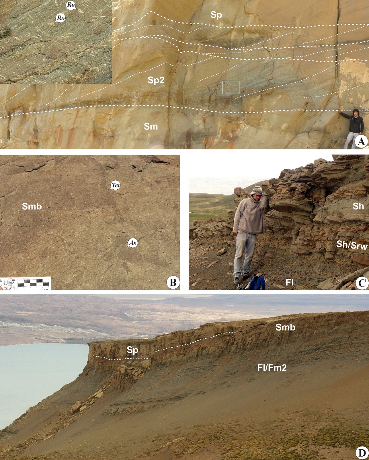 Subfacies D3 is dominated by fine-grained lithofacies such as Fl and Ht. It grades upward into D1 and D2. The exposure of this subfacies is poor although in some concretionary levels it shows delicate heterolithic lamination with minute Teichichuns isp. and Planolites isp. (Fig. 5B).