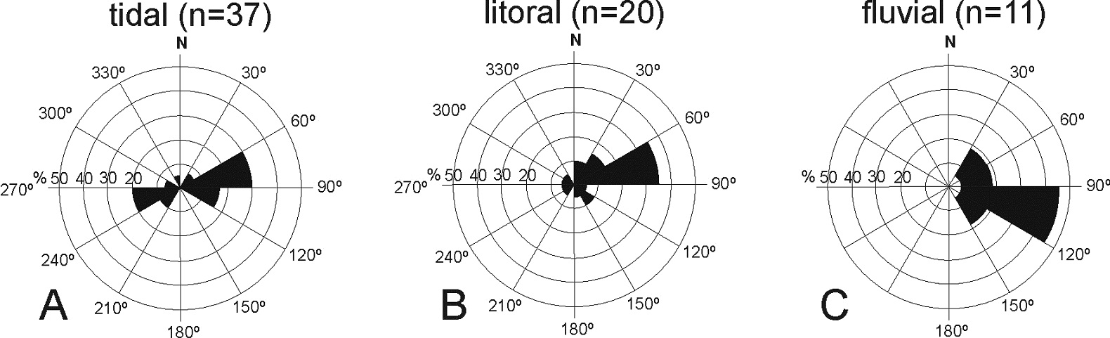 The abundance of mud drapes, the neap-spring tidal cyclicity observed in some cross-bedded sets and the bipolar paleocurrent pattern suggest a strong tidal influence on the deposition of this facies. The sandy grain-size plus the scarcity of trace fossils dominated by vertical burrows, suggest a high-energy setting. Large-scale cross-bedded sets showing mud drapes and monospecific Rosselia isp suites, suggest alteration of periods of fast sedimentation with periods of paucity in sedimentation (e.g., Desjardins et al., 2010). Facies A is interpreted as deposits of subtidal dunes (Sp, St and Sp2), under the influence of strong tidal currents (Dalrymple and Rhodes, 1995). The presence of large, simple cross-bedding sets of nearly 3 m thick suggest deposition by large dunes in water deeper than 15 m (Allen, 1980; Ashley, 1990), that together with the absence of channelized sedimentary bodies, suggests a tide-dominated shallow shelf to outer estuarine environment of deposition (Dalrymple, 2010).