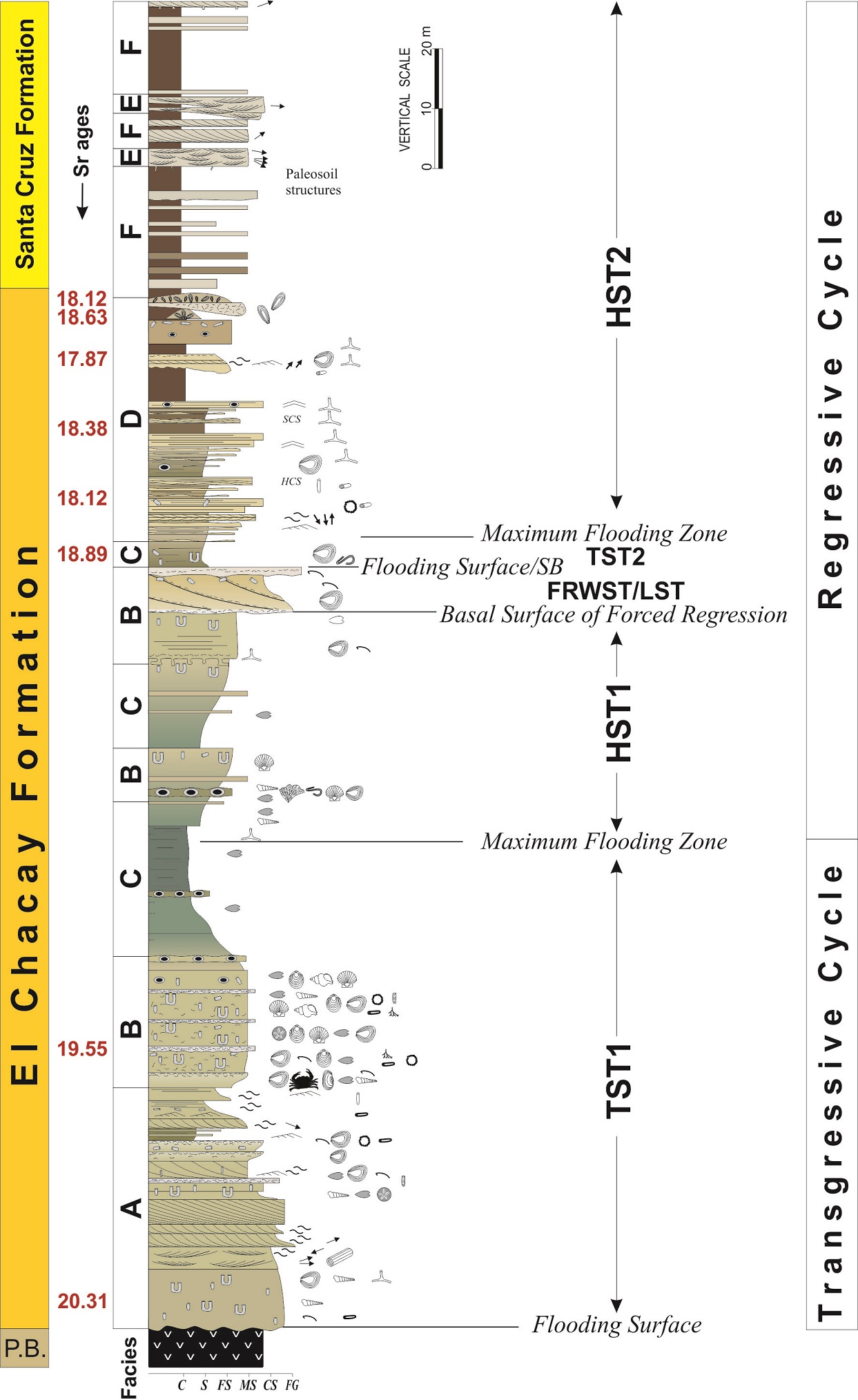 Based on facies distribution, key stratigraphic surfaces and correlation among the sedimentary sections of the El Chacay Formation and the base of the Santa Cruz Formation, a general transgressive-regressive (T-R) cycle can be recognized throughout the succession. Its base lies above an unconformity eroded on the Eocene Posadas Basalt (Figs. 2 and 7), which involves a hiatus of about 25 my. An irregular relief on top of the basalt is evidenced by the 35 m of thickness variation of the lower part of the El Chacay Formation (Fig. 2). A bed about 5 m thick of poorly exposed, possibly terrestrial deposits, whose age and stratigraphic affinity are uncertain, is preserved between the Posadas Basalt and the early Miocene marine deposits in the basal portion of the El Chacay Section (Fig. 2). It was not included in our facies analysis because exposure is poor and the paleoenvironmental/stratigraphic interpretation that could be extracted from would be highly hypothetical. This basal bed and the overlying thick deposits of El Chacay Formation in the El Chacay Section (Fig. 2) are indicative of paleo-lowlands with increased accommodation space. Paleohighs of the Posadas Basalts are associated with thinner and higher-energy shallow marine deposits of the El Chacay Formation, such as those deposited on the flooding surface observed in the Puesto El Chacay Section (Fig. 2). No coastal or estuarine deposits are present immediately below the flooding surface especially in areas interpreted as paleohighs (e.g., the Puesto El Chacay Section), possibly due to erosion caused by the strong tidal currents that also shaped the overlying subtidal sandbars (Facies A) as the sea level rose during the initial transgression (tidal ravinement). As the sea level rose, tidal and wave action on the sea bottom diminished thus reducing local energy and the grain-size of the sediments being deposited. The increase in water depth also meant that organisms had enough time to colonize and rework the substrate that became highly bioturbated (Facies B). When sea level was at its maximum, the sedimentary system reached its lowest energy thus allowing the deposition of mud on the sea bottom (Facies C, shelf deposits). The recognition of the Maximum Flooding Surface (MFS) is not straightforward because the muddy interval is homogeneous and locally not exposed. Hence, a Maximum Flooding Zone (MFZ) is defined instead of the MFS, associated with the finest deposits within this muddy horizon. In general, the fining-upward vertical succession of facies A, B and C defines a first Transgressive Systems Tract (TST1, Fig. 7).
