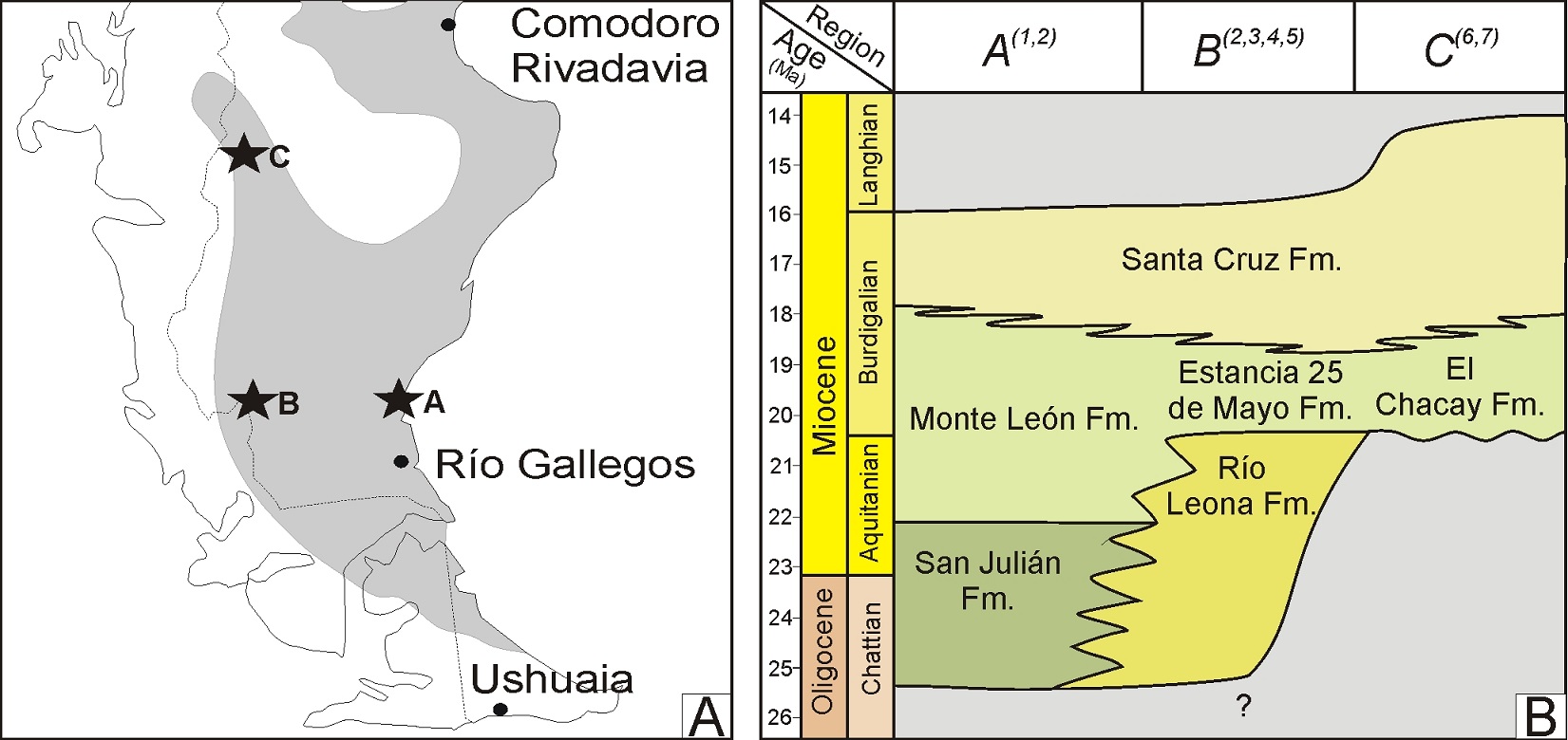 The “Patagoniense” deposits in the study area (Hatcher, 1900; Feruglio, 1949) can be correlated with other similar units in southern Patagonia such as the Guadal Formation in Aisén, Chile (Heim, 1940; Niemeyer et al., 1984; Flint et al., 1994; Frassinetti and Covacevich, 1999; De la Cruz and Suárez, 2006), Estancia 25 de Mayo Formation in Lago Argentino and Sierra Baguales (Cuitiño and Scasso, 2010; Cuitiño et al., 2012; Bostelmann et al., 2013) and Monte León Formation in southeast Provincia de Santa Cruz (Parras et al., 2008; Parras et al., 2012). All these units of the Austral Basin can be correlated with the Patagoniense deposits of the Golfo San Jorge Basin to the north (Feruglio, 1949; Malumián et al., 1999), grouped into the Chenque Formation (Bellosi, 1990, 1995) and recently dated between 19.3 Ma and 15.4 Ma in the Comodoro Rivadavia region (Cuitiño et al., in press).