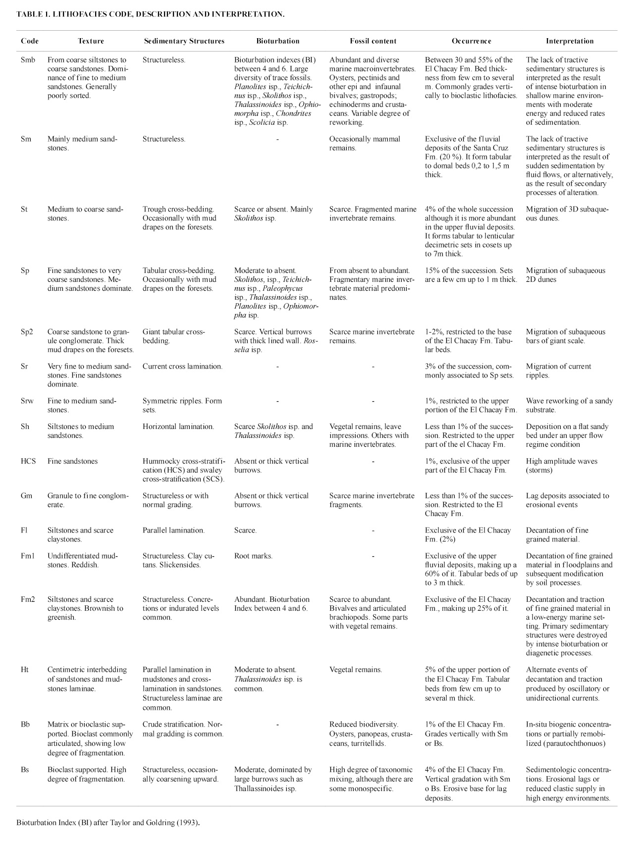 Sedimentologic, paleontologic and ichnologic data were integrated into a facies analysis in order to define the paleoenvironmental setting. The nature and hierarchy of the bounding surfaces of the sedimentary bodies were also used for stratigraphic interpretation. The facies analysis was also based upon the definition of lithofacies (Table 1) characterized mainly by texture, sedimentary structures, bioturbation and nature of the fossil remains. Sixteen lithofacies were defined (Table 1), two of which consists of bioclastic accumulations of fossil invertebrates that are a noticeable feature in the studied succession. The comparison and spatial distribution of the lithofacies, together with paleocurrent data and nature of the bounding surfaces, allowed defining 6 facies, which represent similar conditions of sedimentation.
