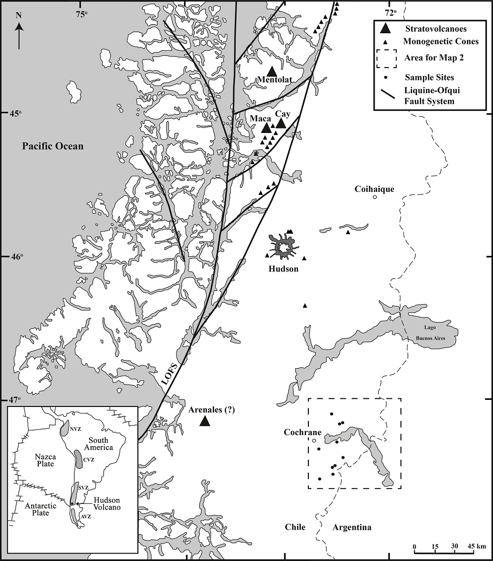 The town of Cochrane, in the region of Aysén, southern Chile (Figs. 1 and 2), occurs within the volcanic gap between the Hudson volcano, at the southernmost end of the Andean Southern Volcanic Zone (SVZ), and Lautaro volcano at the northernmost end of the Austral Volcanic Zones (AVZ) to the south (Stern, 2004; Stern et al., 2007). However, it has also been suggested, but never confirmed, that there is a possible volcano Arenales in this volcanic gap (47.2° S; 73.5° W; Fig. 1) to the west of Cochrane (Lliboutry, 1999).