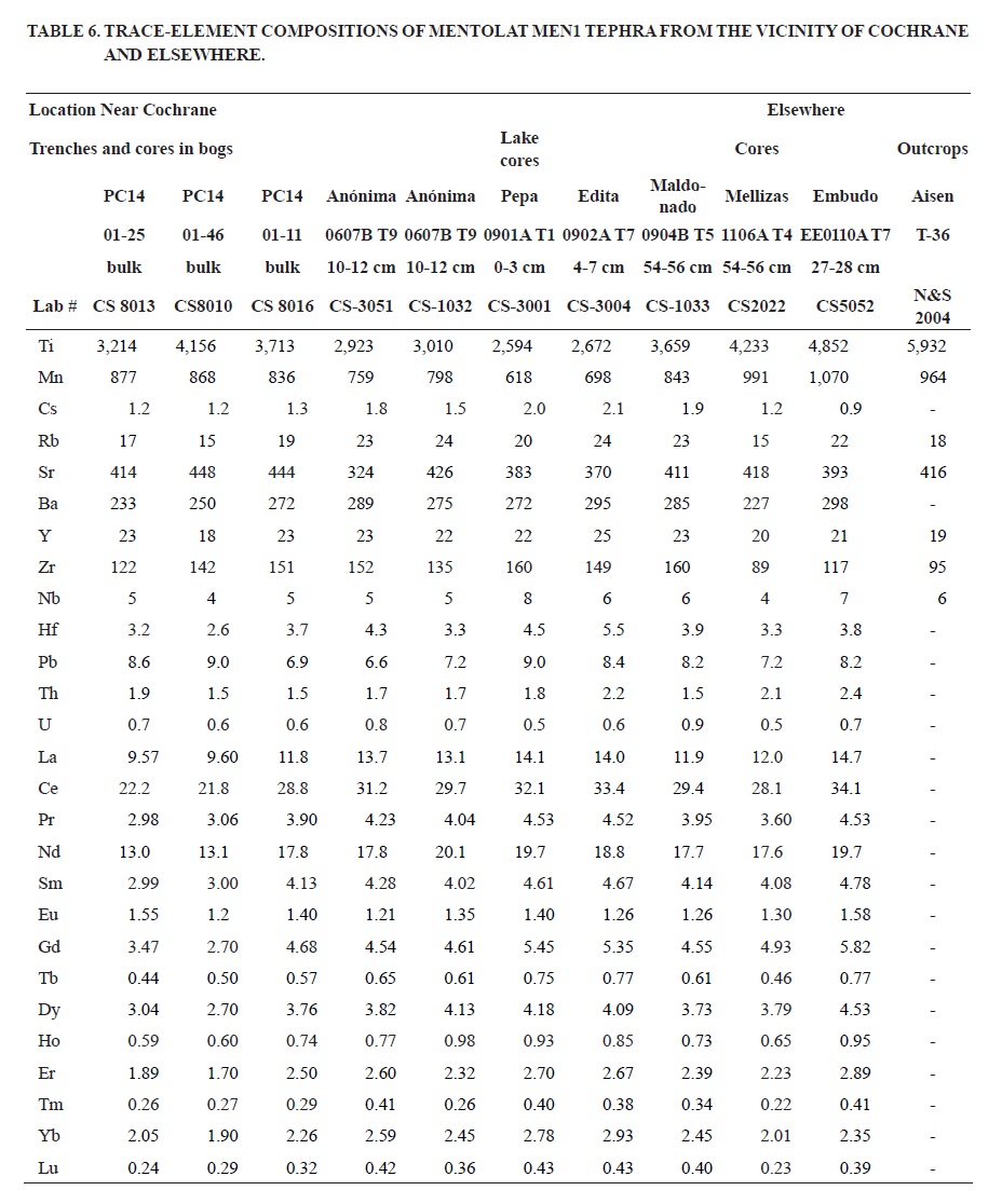 Their age, thickness and all these petrochemical characteristics indicate that they are the same MEN1 tephra identified by Naranjo and Stern (2004) further to the north along both the Simpson and Mañiguales Rivers northwest of Coyhaique (Aisén sample T-36, Table 6), by Weller et al. (2015) in cores near Coyhaique (Mellizas, Table 6), and by Stern et al. (2015) in cores from the upper Río Cisnes valley (Embudo, Table 6).