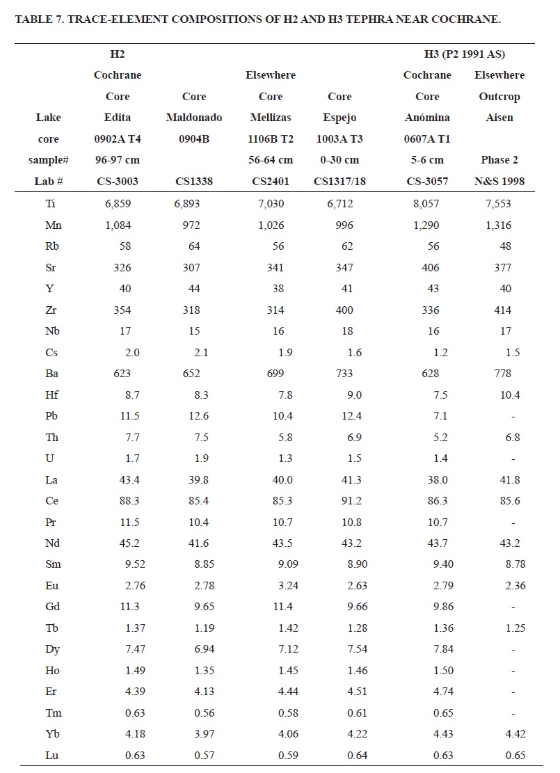 Thin (<2 cm) Late Holocene tephra layers occur in some of the cores, but not in any of the trenches or outcrops. These are petrologically somewhat similar to H1 tephra, with plagioclase and pyroxene phenocrysts and brown glass with stretched vesicles, although the glass has a lighter color than H1 tephra glass. Bulk tephra also has higher Rb, Ba, Zr, La and Yb, but lower Ti contents than H1 tephra (Table 7; Fig. 8). Their late Holocene age, as indicated by their location relative to H1 tephra in the cores, and their chemistry and thickness is consistent with this tephra being a distal layer of the Hudson H2 eruption at approximately 4000 cal yrs BP (Naranjo and Stern, 1998).