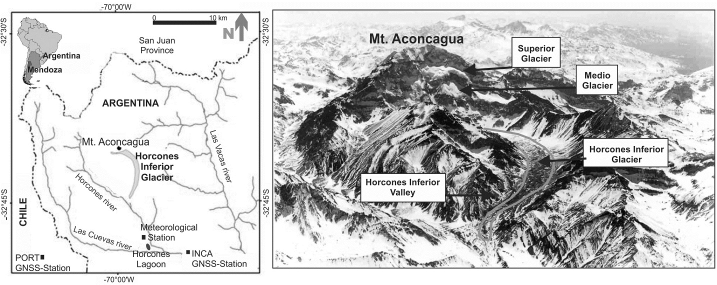The Horcones Inferior Glacier (HIG) is located at 32°41’ S, 69°57’ W, in the southern slopes of Mt. Aconcagua (6,962 m a.s.l. -highest point in the Americas), Argentina, as shown in figure 1. The total glacierized area is 5.6 km2, and 11 km of length. The HIG is fed from Superior and Medio Glaciers, which are hanging glaciers on the south face of Mt. Aconcagua. The type of feeding by contribution of snow avalanches makes the HIG comparable to other typical cases of surging glaciers (Hewitt, 1969). Fresh ice from these glaciers incorporates into the reconstituted HIG, which is steadily covered by debris from talus and snow avalanches. Below 4,200 m a.s.l.,the glacier ablates, and the surface presents a large amount of thermokarst and meltwater ponds. Observations near its terminus suggest that HIG has a temperate bed, as Benn and Evans (2007) define these characteristics.