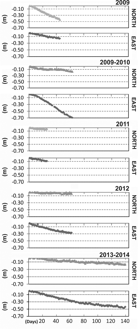 Figure 5 shows the daily rate of the HIS1 station horizontal position changes during the five seasons. The data displays horizontal surface displacements that are similar for the five periods, except for the 2009-2010 season. The mean surface velocities for HIS1 are listed in Table 3, where the accuracy and also the surface movement’s direction are shown. The VS (Surface velocity) values estimated during the 2009 and 2009-2010 field seasons were similar, but the motion rate was reduced by approximately 50% in the following seasons, indicating that the glacier was slowing down and reducing the advance rate towards the terminus. The VH represents a spatial pattern of glacier movement. The lowest velocity, -0.6 cmd-1, and the highest one, -1.6 cmd-1, were observed in the 2013-2014 and 2009-2010 field seasons respectively, with an average velocity of -0.96 cmd-1 for the whole 2009-2014 period. The seasonal VH changes showed an interesting pattern in the 2009-2010 season, due to an increase of approximately 45% in the rate of diminishing elevation change. From December 2010 onwards, the altitude changes began to stabilize and are more constant values in later field seasons.