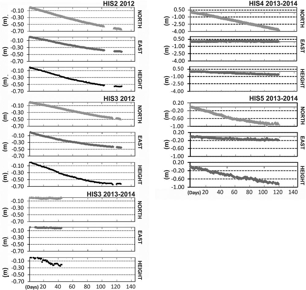 FIG. 6. Displacement and elevation changes of the HIS2, HIS3, HIS4 and HIS5 stations for the North, East and Elevation component over the 2012-2014 campaigns.