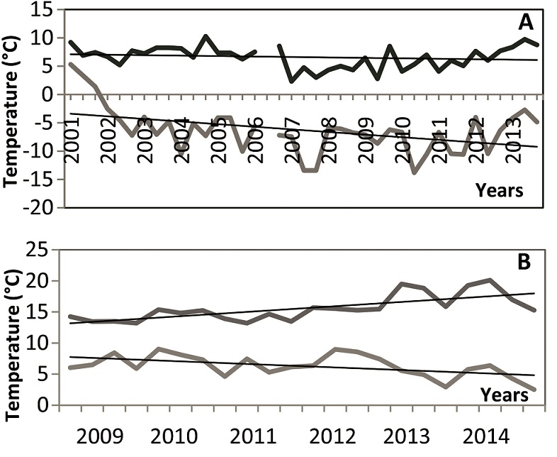 On the other hand, in order to correlate the glacier thinning retrieved in this study and local climate conditions, daily temperature records from the Horcones meteorological station (2,800 m a.s.l) were analyzed. This station is placed in the proximity of the Laguna de Horcones, 5 km south of HIG (Fig. 1). Figure 8A shows the monthly mean, maximum and minimum temperatures for the winter (cold) season (June, July, August) over the 2001-2013 period. The data shows a slightly cooling trend over the 14-years period, although the maximum winter temperatures have increased since 2009. Nevertheless, if the results of the lowermost GNSS survey station HIS1 site are analyzed, (which has the longest available data record, 2009-2014), elevation changes increase in the 2009-2010 season, when the highest rates occur (~50% in VH, Fig. 4). Therefore, the warm (summer) months (December, January, February and March) over the 2009-2014 period of the Horcones weather station time series were examined (Fig. 8B), and a significant increase in the maximum temperature values is observed, as well as in the minimum temperatures of January and February of 2010 (30% approximately) respect to the previous year. However, the results from Table 3 indicate that the glacier slows down towards its terminal part and had, in the terminal portion, minor decelerating surface movement over the 2009-2014 period.
