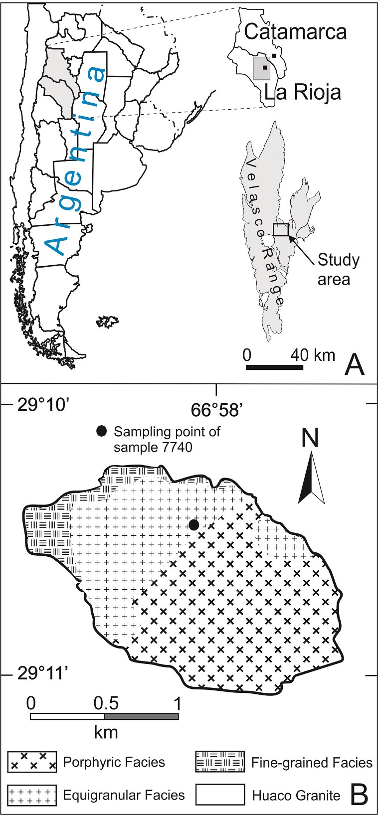 The La Chinchilla Stock granitoid corresponds to the latter magmatism, based on U-Pb dating of monazite (344.5±1.4 Ma; Grosse et al., 2009). First defined by Grosse et al. (2005), it is a small body of ~2x2 km, of monzogranitic composition, that intruded into the Huaco Granite (350-358 Ma). The contacts between the two bodies have sub-vertical as well as sub-horizontal dips, with the La Chinchilla Stock below and the Huaco Granite upwards, suggesting proximity to the stock roof (Grosse et al., 2005). The monzogranite is characterized by three textural facies: border, porphyritic, and equigranular facies. Pegmatite dikes are abundant in the equigranular facies (Salvatore et al., 2013).