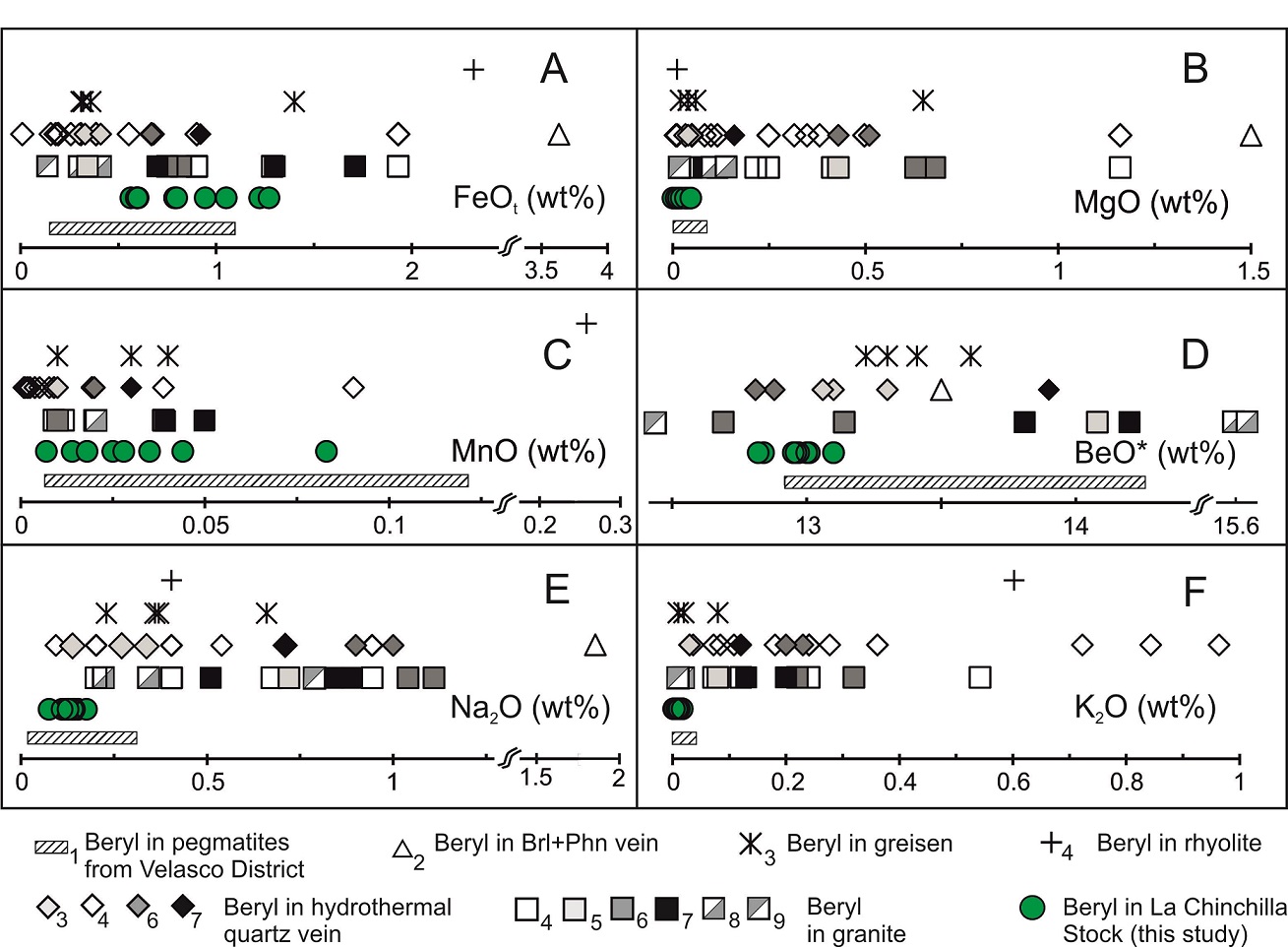 Fig. 5. Chemical variation diagrams showing the composition of beryl from the La Chinchilla Stock, non-pegmatitic beryl from different geological origins, and beryl from pegmatites of the Velasco District, Argentina. A. FeOt (wt%); B. MgO (wt%); C. MnO (wt%); D. BeO* (wt%); E. Na2O (wt%); F. K2O (wt%). BeO* calculated from stoichiometry. References as in figure 4.
