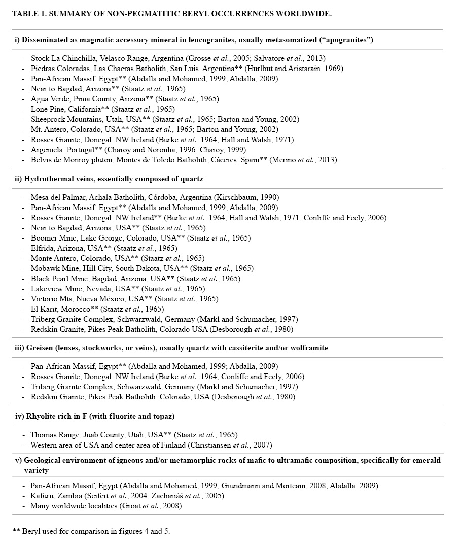 Beryl, with an ideal formula given by Be3Al2Si6O18, is a common accessory mineral in granitic pegmatites (Tindle and Breaks, 1998; Charoy, 1999; Černý et al., 2003; Alfonso and Melgarejo, 2008; Thomas et al., 2009, 2011; Uher et al., 2010; Rao et al., 2011; Sardi and Heimann, 2014), especially those of the LCT (Li-Cs-Ta) family (based on the classification of Černý, 1991), occasionally appears associated with chrysoberyl in Be-rich pegmatites (Soman and Nair, 1985; González del Tánago, 1991), as well as in highly evolved granites (Charoy and Noronha, 1996; Charoy, 1999; Merino et al., 2013). It is a source of Be, which is used primarily for alloys with other metals to achieve a lightweight and durable steel, and for nuclear and high technology applications (Barton and Young, 2002). In granitic pegmatites, the mineral can develop idiomorphic crystals from millimeter size to more than ten meters long (as occurs in some pegmatites from Madagascar; Černý, 2002). In some cases beryl develops gemological varieties of great value, such as heliodor (clear, transparent yellow beryl) and aquamarine (light green to blue with a high degree of transparency) in pegmatites (e.g., Proctor, 1984). However, non-pegmatitic beryl can also represent an important source of gemstones, especially emerald and aquamarine (Barton and Young, 2002; Seifert et al., 2004). In fact, beryl can occur as a mineral in other environments of varied and complex geological nature (such as metamorphic; Downes and Bevan, 2002; Novák et al., 2011), and, in particular, is an accessory mineral in geochemically evolved, F-rich, metasomatized granites (e.g., Černý et al., 2003). Table 1 presents a summary of the types and examples of non-pegmatitic beryl (hydrothermal vein, greisen, rhyolite) occurrences worldwide.