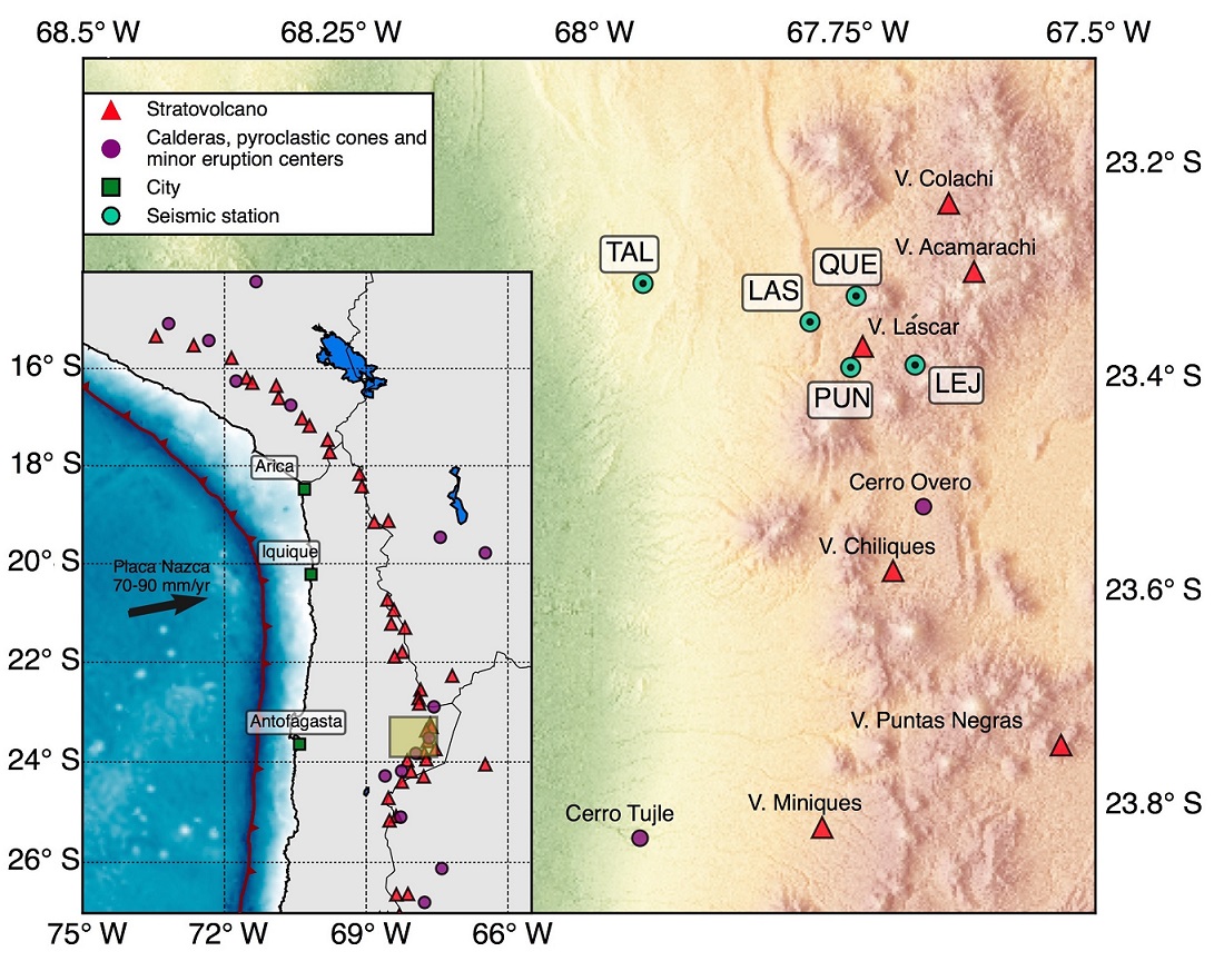 Láscar is a stratovolcano located at 23.95° S, 67.88° W, and 5,592 meters of altitude, at approximately 350 km from the trench separating the Nazca and South American plates (Fig. 1). It has been active since at least 50 ka. Its recent activity is characterized by the continuous emission of gases and occasional sub-plininians eruptions, as in April 1993. In 2006, the Observatorio Volcanológico de los Andes del Sur (OVDAS) reported an increase of activity characterized by a plume emitted by the main cone, up to an altitude of 3,000 above the crater. Most recently, between March and April 2013, OVDAS reported an increment of the number of seismic Long period events, together with a degasification process and incandescence near the crater of Láscar volcano.