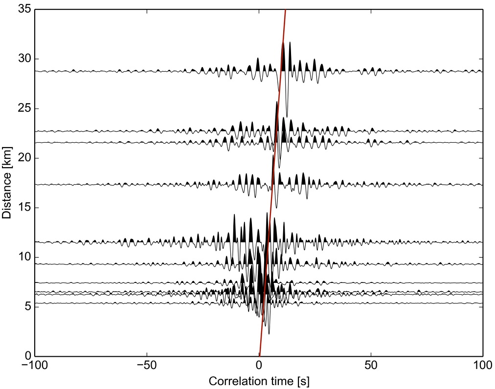 Fig. 2. Stacked cross-correlation for each station pair. The red line shows the surface wave arrival.