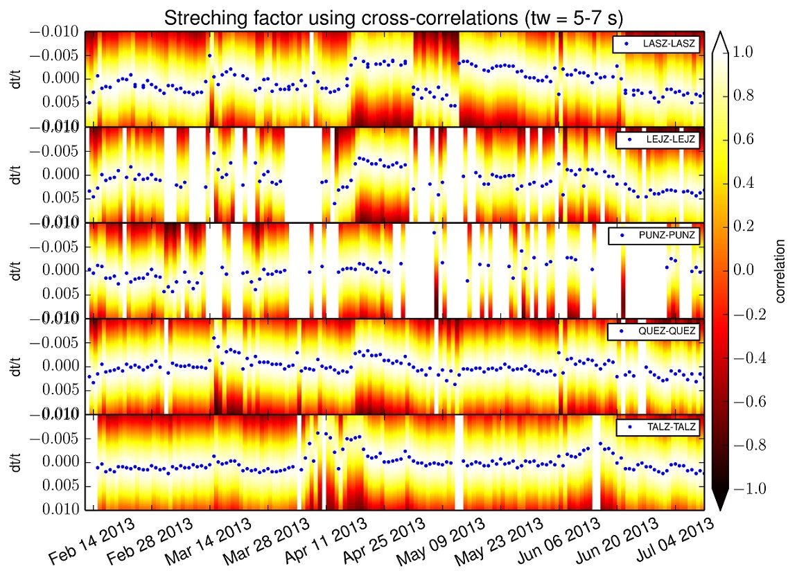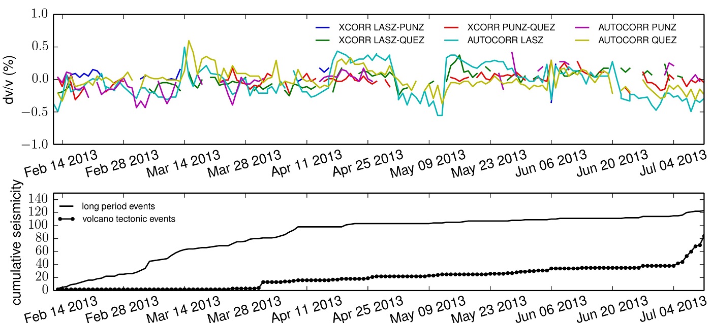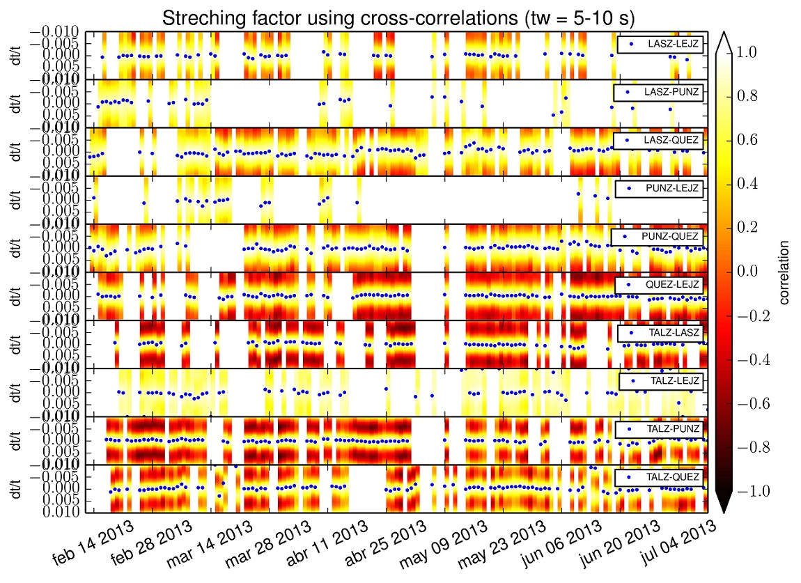 Our main result is the calculated stretching factor dt/t shown in figures 4 and 5 for cross- and auto- correlations. Blue dots indicate the stretching values with the highest correlation factors R (for R>0.8). There are common features on the observed velocity variation through time, obtained from the cross- and auto-correlation for different stations, as shown in figure 6. If these features are due to a real phenomenon, and not to a processing artifact, then, it would prove to be a powerful tool for studying volcanic processes near volcanoes, and also serve as a monitoring tool. Among these common features one can observe a period between March and April 2013, with an abrupt increase of velocity (~0.6% at QUE station) followed by a slow decrease. These changes could be due to a deflation process followed by an inflation process related to a loading and unloading of a hydrothermal and/or magmatic system beneath the Láscar volcano.