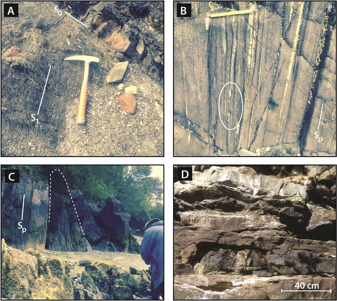 Fig. 3. Photographs of outcrops from which the analysed samples were taken. A. Cleaved siltstones and sandstone bed (FO1415) at Puerto Bonito, SW shore of Llancahue island, mapped as part of the late Paleozoic-Triassic basement by Cembrano (1990) and Encinas et al. (2013). Stratification (S0) and main cleavage (S1) are indicated; B. Micashists at Punta Quiaca, southern end of Isla Llancahue, mapped as higher-grade part of the Late Paleozoic-Triassic basement by Cembrano (1990). Main foliation Sp (probably S1), showing boudinaged veins (inside the white ellipse); C. Lllancahue epi-metamorphic complex at Punta Quiaca showing an interpreted tight fold (dashed lines) of quartzite bed with axial plane cleavage Sp (FO14158); D. Huinay schists: alternating bands of amphibolite facies metamorphic rocks and granitic bodies (FO14153) at Fiordo Cahuelmó. |