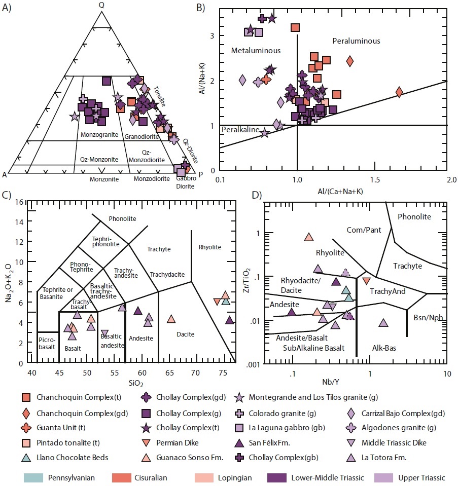 FIG. 4. a. QAP classification and b. alumina saturation index diagrams for plutonic rocks (Shand, 1927), c. TAS (Lebas et al., 1986) and d. Nb/Y versus Zr/TiO2 (Winchester and Floyd, 1977) classification diagrams for volcanic rocks. Symbols with dashed lines and color gradient represent the two strongly altered samples of volcaniclastic rocks from the San Félix (CPV-12-38) and La Totora (SCL-26Q) formation. |