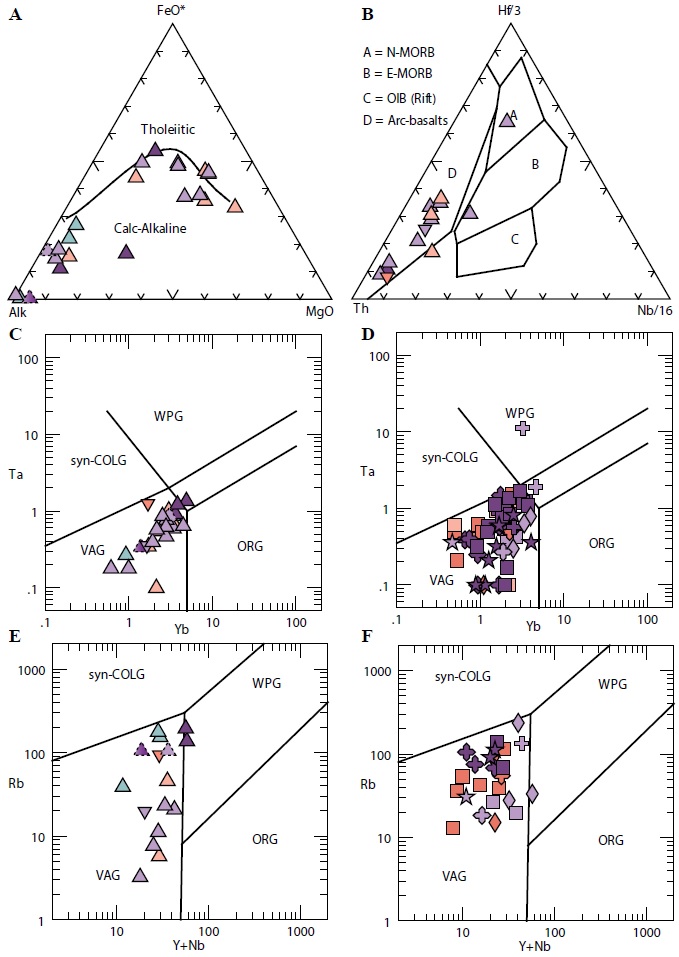FIG. 7. Tectonic discrimination diagrams for the studied samples. a. AFM (Irvine and Baragar, 1971) and b. Th-Nb-Hf for basic and intermediated volcanic rocks; Yb versus Ta diagram (Pearce et al., 1984) for c. acid volcanic and d. plutonic rocks; Yb+Nb versus Rb (Pearce et al., 1984) for e. acid volcanic and d. plutonic rocks. Symbols with dashed lines and color gradient represent the two strongly altered samples of volcaniclastic rocks from the San Félix (CPV-12-38) and La Totora (SCL-26Q) formation. |