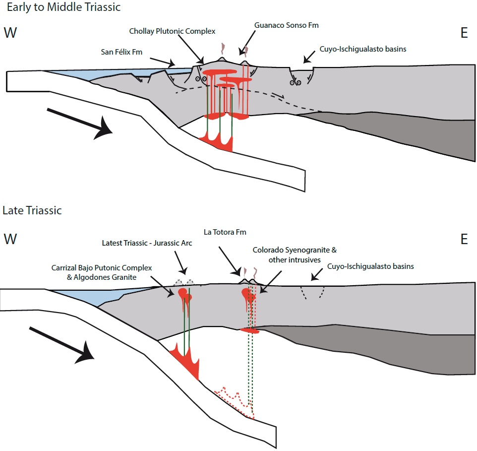 The detailed architecture of the Andean margin from the Permian to the Triassic is relatively unknown. The Chanchoquín and Chollay plutonic complexes would represent the roots of a magmatic arc developed from the Permian to the Middle or early Late Triassic, whereas the Guanaco Sonso and Pastos Blancos formations would be the shallower parts of the volcanic arc. The San Félix formation likely represent a forearc basin developed throughout the Triassic. The La Totora Formation and some intrusive units that may have slight intraplate or transitional geochemical signature are products of a magmatism developed immediately before the establishment of the magmatic arc in the present-day coastal cordillera, which took place at some time during the Rhaetian to Early Jurassic.