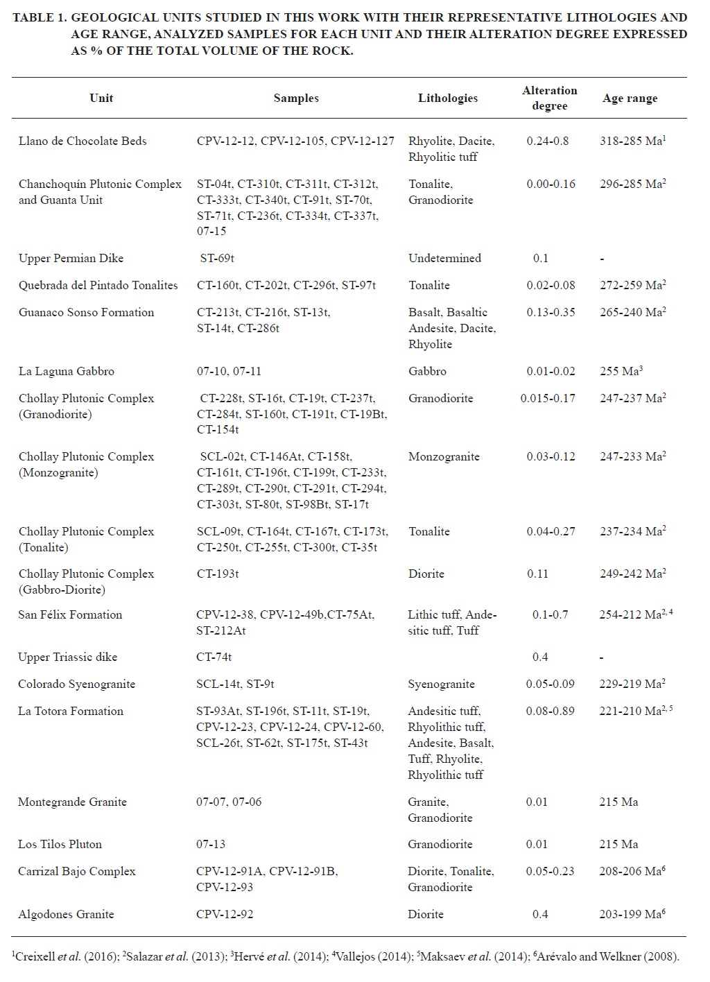 Major and trace elements abundances for the studied volcanic and plutonic rocks are listed in Table 2 and in Salazar et al. (2013). Prior to the description of the geochemical results, the issue of the secondary alteration processes that affected the studied rocks is addressed.
