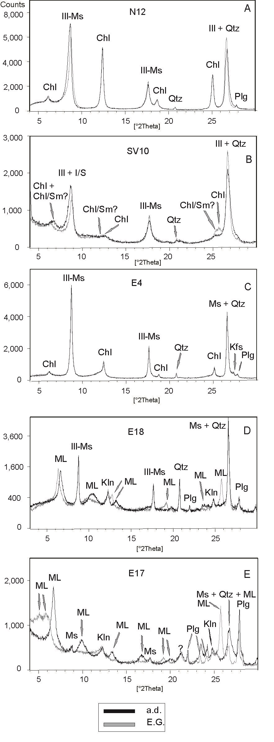 Three groups of samples can be distinguished according to their clay-mineral assemblages. In the first group the clay fraction is composed by illite-muscovite and chlorite (Fig. 2c, samples: E4, E5 and E9). Other group consists of illite-muscovite+kaolinite+smectite (samples E6, E7 and E15). On the other hand, most of the samples show complex clay-minerals assemblages comprising: illite-muscovite±chlorite±Chl/Sm±Chl/Vrm±kaolinite±Chl/Mi±smectite. For example, the XRD pattern of the air-dried oriented mount of slate E 18 depicts the characteristic reflections of illite-muscovite and kaolinite, but also an almost rational series of reflections at 13.36, 8.53, 6.70, 5.22, and 4.49 Å, that shift towards slightly higher values after the ethylene glycol (EG) treatment, indicating a nearly regular mixed-layer containing an expandable component (Fig. 2d).