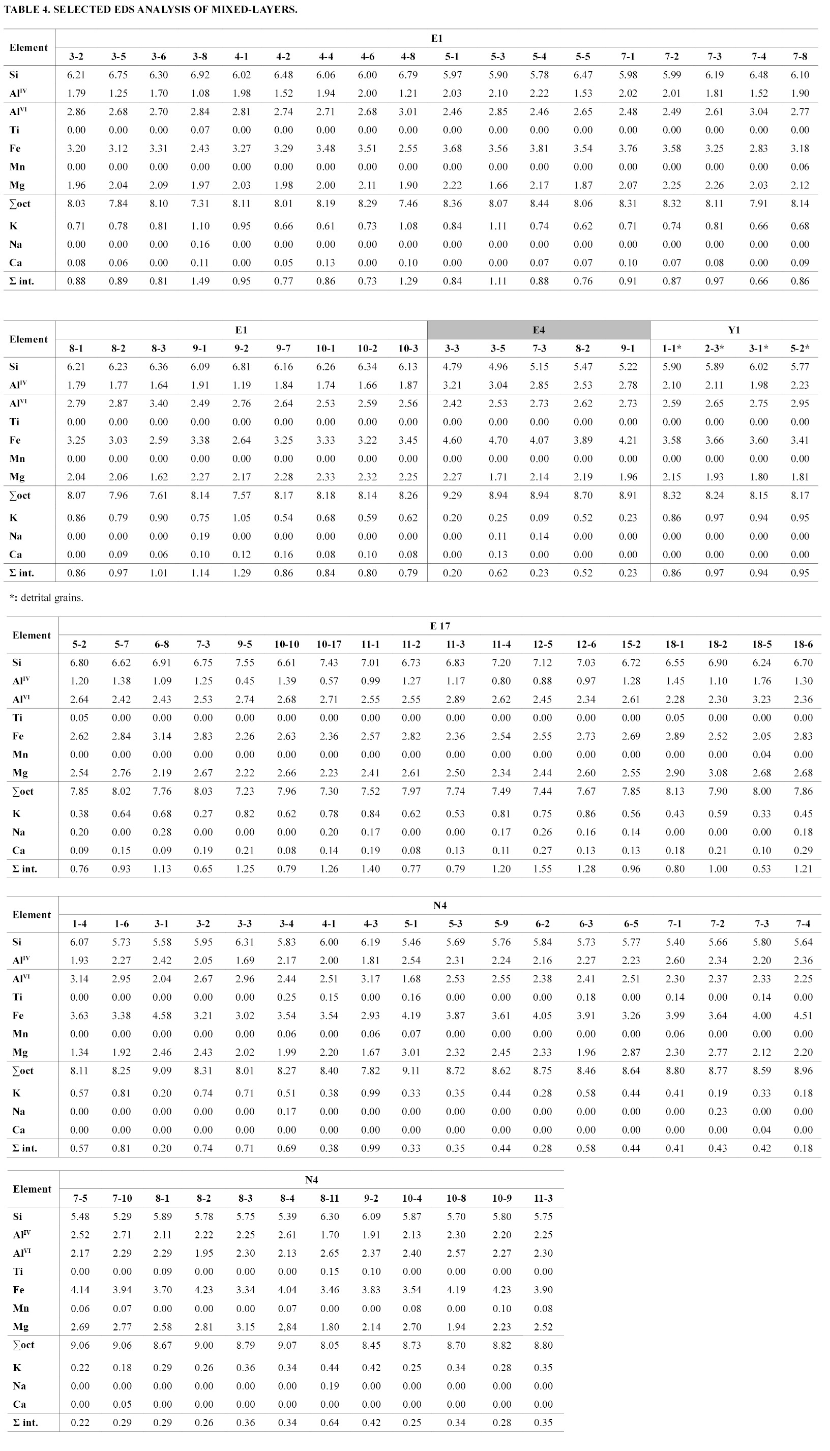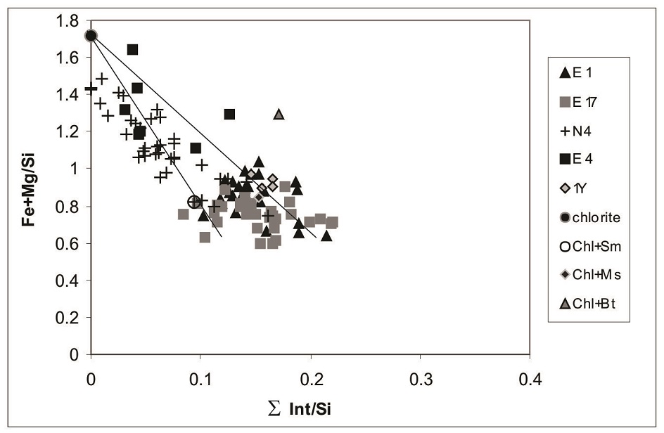 Most of the analyses from mudstone N4 as well as few from slate E4 plot to the left of the upper line that connects the chlorite and 0.5/0.5 Chl-Sm composition, thus vermiculite-like layers are probably the third component of some of these mixed-layers sequences (Fig. 8). On the other hand, for slateY1the few analyses compatible with chlorite-bearing mixed-layers correspond to IPG (Fig. 4c) or biotite grains, both detrital in origin. They plot near the point corresponding to 0.5/0.5 Ms-Chl compositions.