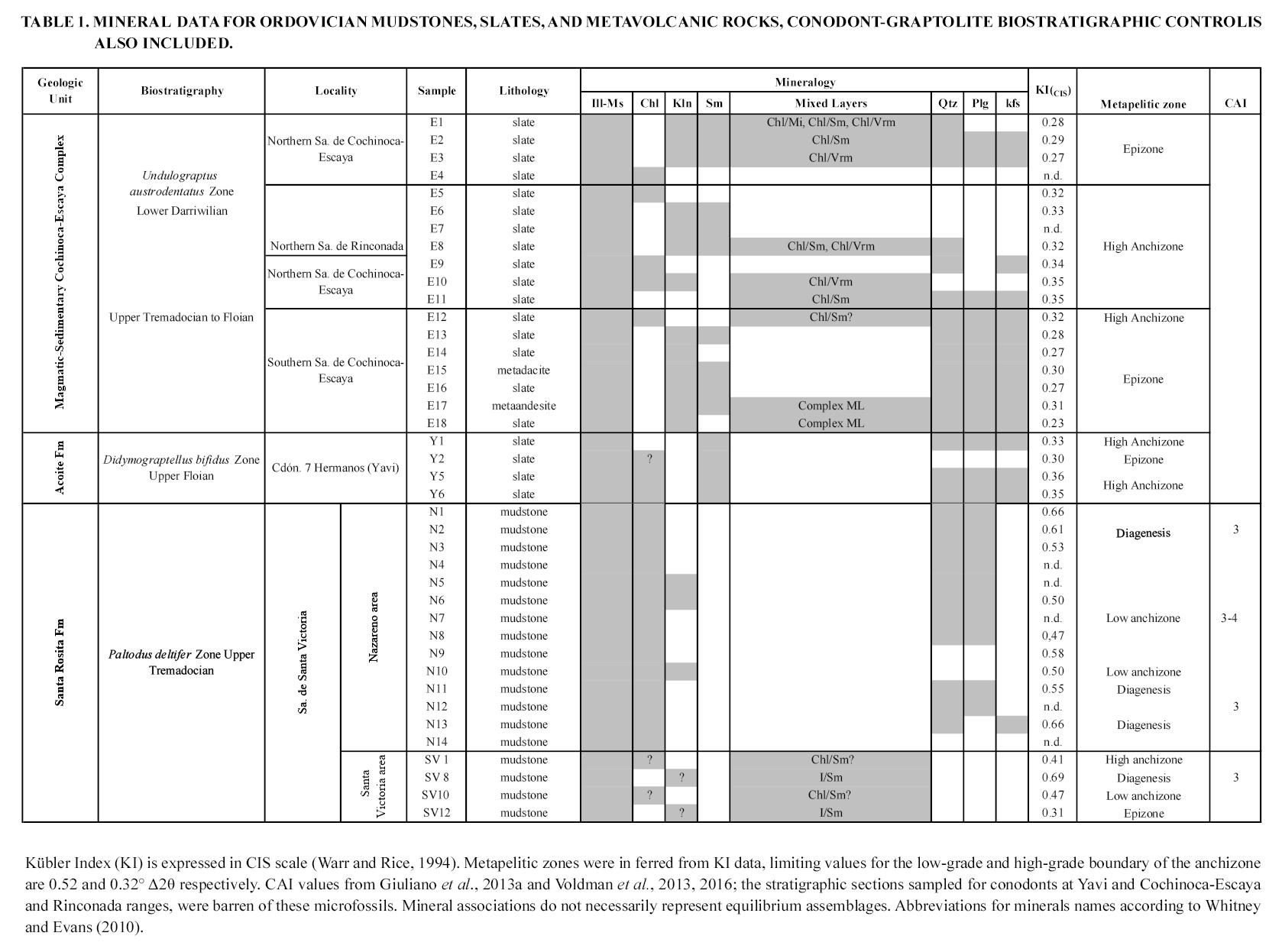- Finally, slates and metavolcanic rocks from Puna show KI values from high anchizone to epizone (0.23-0.35°Δ2θ). In these slates a discontinuous crenulation cleavage (S1) oblique to S0 or an S1 cleavage, mainly sub parallel to the sedimentary layering (S0) is observed. Few samples of this group show clay-mineral assemblages comprising illite-muscovite and chlorite, in coherence with the anchizonal/epizonal grade indicated by KI values. On the contrary, most of the samples consist of complex clay-minerals assemblages comprising, in addition to illite-muscovite and rarely chlorite, diverse phyllosilicates like kaolinite, smectite, and various mixed-layers (Chl/Sm, Chl/Vrm and Chl/Mi) that are not stable in the anchizone and neither in the epizone (Merriman and Peacor, 1999). Consequently, these phases could not represent prograde metamorphic phases in these rocks.