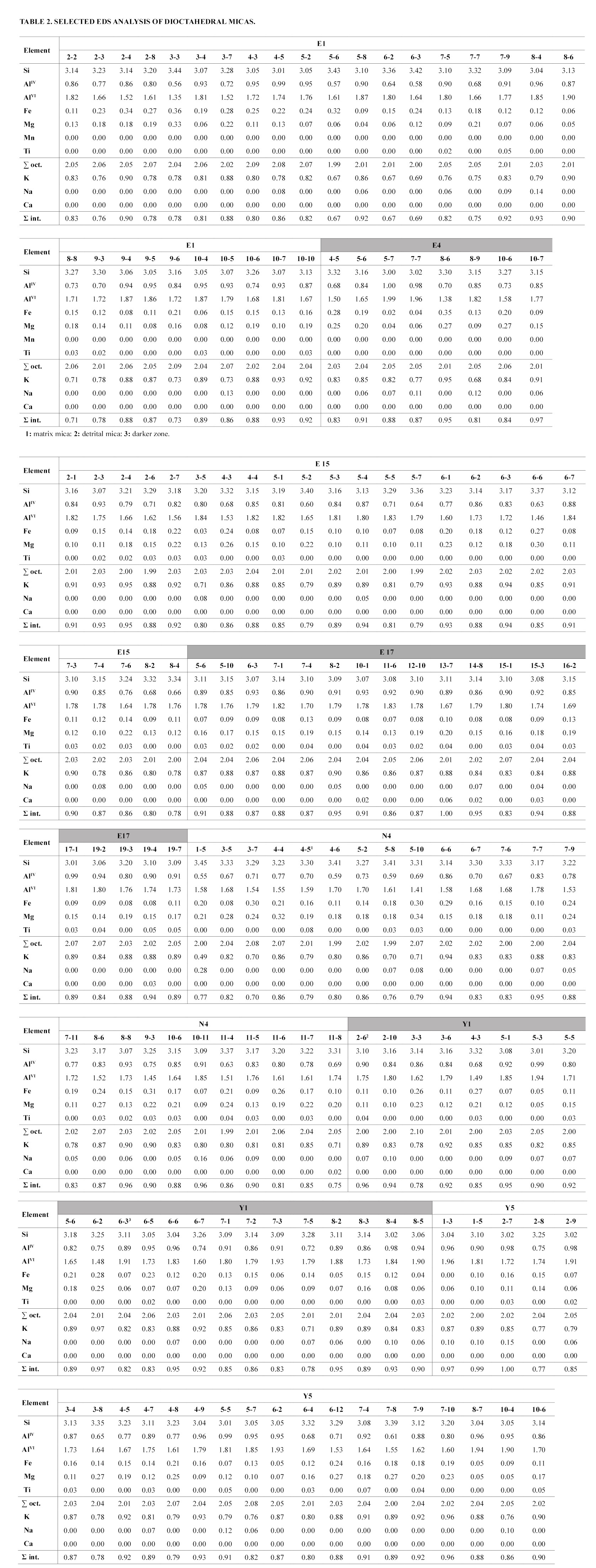 In most of the micas, Na/Na+K are lower than 0.05, indicating minor paragonitic substitution (Guidotti, 1984; Guidotti et al., 1994b). However, in 28% of the analysed grains this ratio reaches values in the range of 0.05-0.17, and even an isolated value of 0.36 (Table 2, N4 1-5). Paragonitic substitution is more extended in micas from samples corresponding to Cordillera Oriental than in those from Puna.