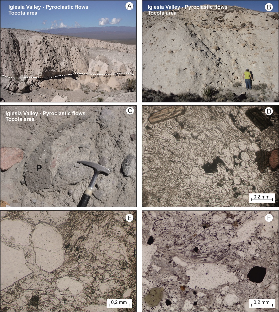 Occasionally, deformation of the juvenile pumice fragments presents in the pyroclastic rocks from Cuesta del Viento is diagnostic of the high temperature conditions that prevailed during the flows (Fig. 3C). Similar rocks are known in exposures located between Iglesia and Las Flores areas and along the Iglesia river Valley where a succession of interlayered surges and pyroclastic flow deposits are exposed and well preserved (Fig. 2).