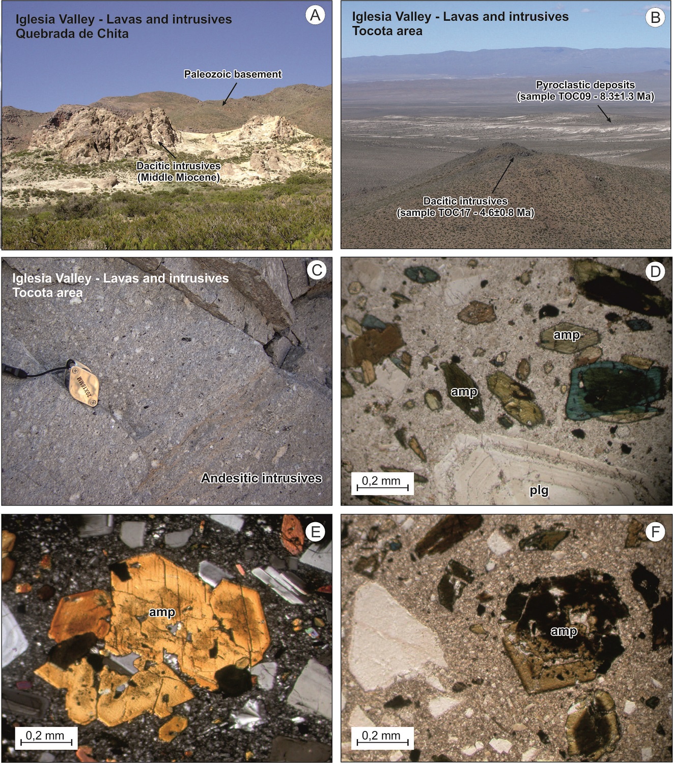 Outcrops constitute small, low and irregular hills with gentle slopes, generally oriented along NS direction (Fig. 4A, B). Lavas and shallow intrusives are andesites and dacites with hornblende and subordinated biotite (Fig. 4C). Some of these rocks have vesicular structure with small cavities, occasionally filled by siliceous material. Their mineralogy is dominantly constituted by plagioclase (oligoclase-andesine) and amphibole, with minor K-feldspar, biotite and opaque minerals, with quartz in the more differentiated rocks (Fig. 4D). Evidence of disequilibrium in the magma chamber is reflected by plagioclase with sieve texture and crystals zoning in amphibole and plagioclase (Fig. 4D, E, F). Usually, there is a cumulus assemblage of mafic phases, mainly amphibole and opaque minerals that could be interpreted as enclaves coming directly from the first stage of magma crystallization. The originally glassy groundmass is characterized by a fine grain association of plagioclase, quartz and in lesser proportion K-feldspar (Fig. 4E, F). Small hornblende crystals and grains of opaque minerals are also present.