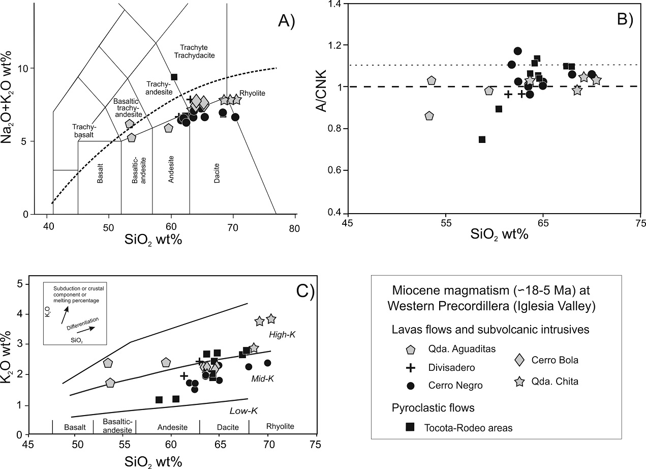 FIG. 5. Geochemical features of Miocene arc-related pyroclastic rocks and lavas from Iglesia Valley, Western Argentine Precordillera. A. Total alkali versus silica classification diagram (Le Maitre et al., 1989); B. Plots of molar Al (Na+K+Ca) ratios versus silica content, showing a metaluminous signature; C. K2O versus SiO2 diagram shows a medium to high-K signature for pyroclastic rocks, lavas and subvolcanic intrusives of the Iglesia Valley area, with a general trend for subduction or crustal components (Kay et al., 2013). |