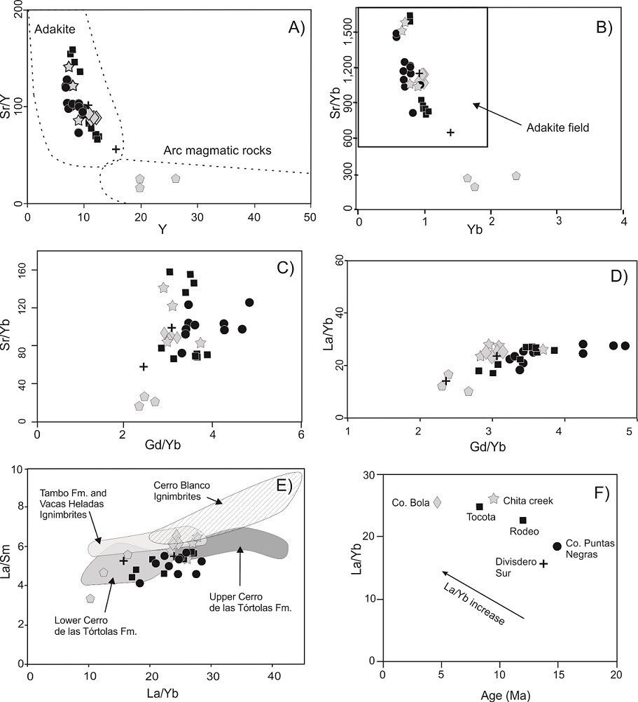 FIG. 7. A. Adakite signature for Miocene Iglesia Valley magmatic rocks according to Sr/Y versus Y plot (Castillo, 2012); B. Sr/Yb ratio versus Yb diagram showing adakitic field (e.g., Defant and Drummond, 1990; Martin et al., 2005); C. Cerro Negro lava flows and Tocota-Rodeo pyroclastics rocks show the higher Sr/Yb and Gd/Yb ratios, indicating a more pronounced adakitic geochemical affinity; D. La/Yb versus Gd/Yb diagram showing adakitic like ratios according to Mori et al. (2007); E. La/Yb versus La/Sm plot for Iglesia Valley Miocene magmatism and coetaneous volcanic rocks from the main arc over the Pampean flat slab (data from Litvak et al., 2007), and rocks from Miocene arc in Southern Puna (data from Montero et al., 2010); F. La/Yb versus age diagram for the Iglesia Valley magmatic rocks dated in this work, they display an increase of La/Yb ratio in younger samples (data from table 2 and Appendix; age for Chita sample corresponds to Jones et al., 2016). Symbols are the same as figure 5. |