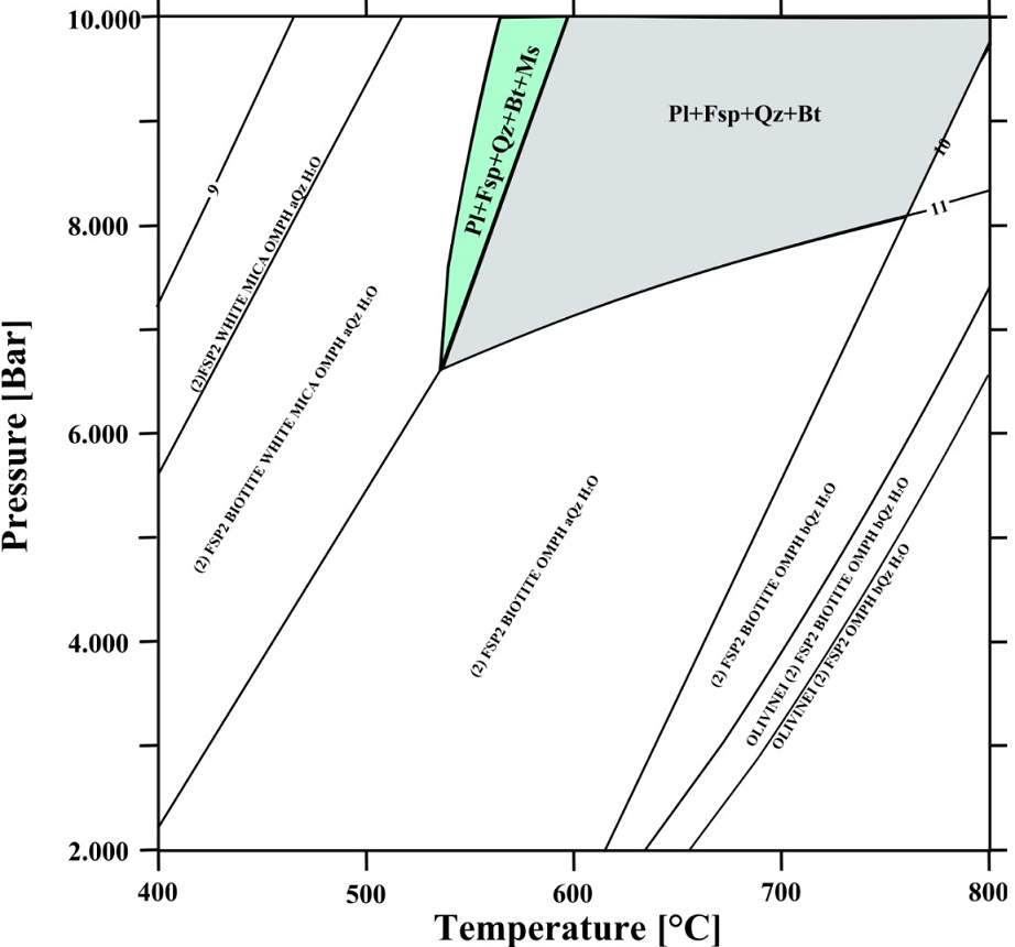 La paragénesis del pico metamórfico del neis cuarzo-feldespático con biotita (muestra VR-22-1) corresponde a Pl+Fsp+Qz+Bt. En la seudosección obtenida, esta asociación es estable en las condiciones entre 6,5 y 10 Kb de presión y 540 y 800 °C de temperatura. Este ortoneis sufrió intensa deformación, y al parecer en la etapa pospico se formó muscovita y fases recristalizadas de plagioclasa, feldespato potásico, cuarzo y biotita. La asociación Pl+Fsp+Qz+Bt+Ms representa esta etapa de recristalización ocurrida a una temperatura entre 550-600 °C y presión entre 6 y 10 Kb (Fig. 7). La etapa retrograda es marcada por la formación de clorita después de biotita y sericita después de plagioclasa.
