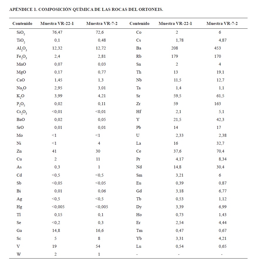Las características geoquímicas de las rocas del Ortoneis son concordantes con las obtenidas por Van der Lelij et al. (2015). Estos autores mencionan entre otros: 1. Rangos en el contenido de SiO2 entre 54% y 75%; 2. Serie calcoalcalina alta en K; 3. Variaciones en el Índice de Shand y relaciones variables entre Na2O y K2O sugieren la presencia tanto de granitos tipo I y S (Chappell y White, 1974) los cuales fueron coetáneos; 4. Las rocas ígneas del Paleozoico Temprano pueden ser un resultado de la mezcla de proporciones variables de masas fundidas derivadas de diferentes fuentes (Maas et al., 1997; Patiño-Douce, 1999); 5. Contenido de elementos traza muy similar al promedio de la corteza continental superior (Taylor y McLennan,1985), con la excepción de las concentraciones de Nb y Ta; 6. Los bajos contenidos de Nb e Y de la mayoría de rocas son característicos de las que se formaron en márgenes convergentes (Pearce, 1996) y 7. La abundancia de REE son generalmente similares a la de la corteza continental superior, con anomalías negativas en europio.