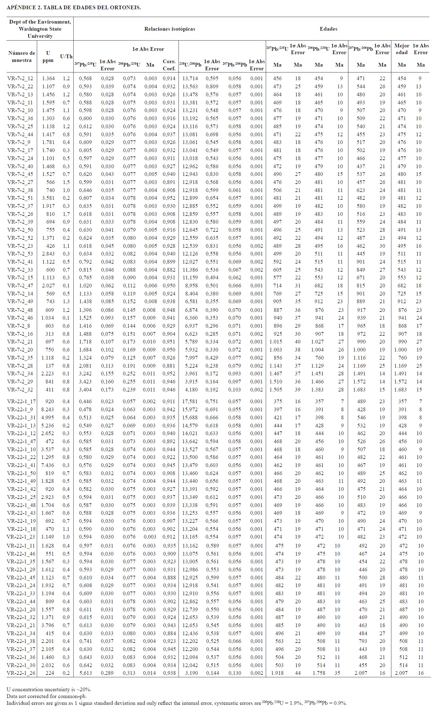 Dos rocas del Ortoneis muestra VR-7-2 (Neis cuarzo-feldespático con biotita y hornblenda) y muestra VR-22-1 (Neis cuarzo-feldespático con biotita y muscovita) fueron analizadas mediante U/Pb LA-ICP-MS (Apéndice 2).