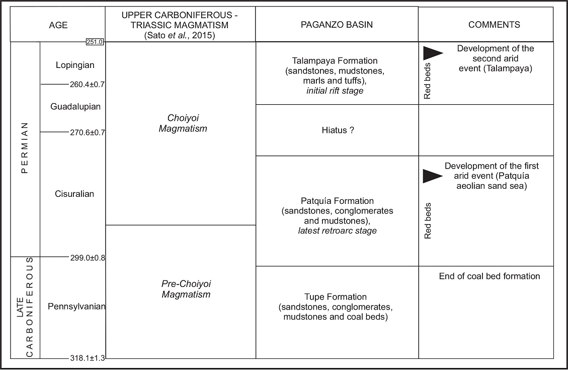 Sato et al. (2015) showed that if the regional development of the Choiyoi Magmatism is compared with the areal extent of the upper Palaeozoic sedimentary basins, a major overlap is recorded especially with the Río Blanco, Calingasta-Uspallata and San Rafael-Las Matras-Chadileuvú basins (Fig. 3). Conversely, in the Paganzo Basin the Permian volcanic rocks corresponding to the Choiyoi Magmatism are not recorded (Fig. 3). Therefore, sedimentation processes in this basin left an almost continuous record of latest early Carboniferous-Permian deposits, as well as the passage from upper Palaeozoic sequences to Triassic sequences. Hence, much of the late Palaeozoic successions in the Paganzo Basin are contemporary with the Choiyoi volcanics in surrounding regions.