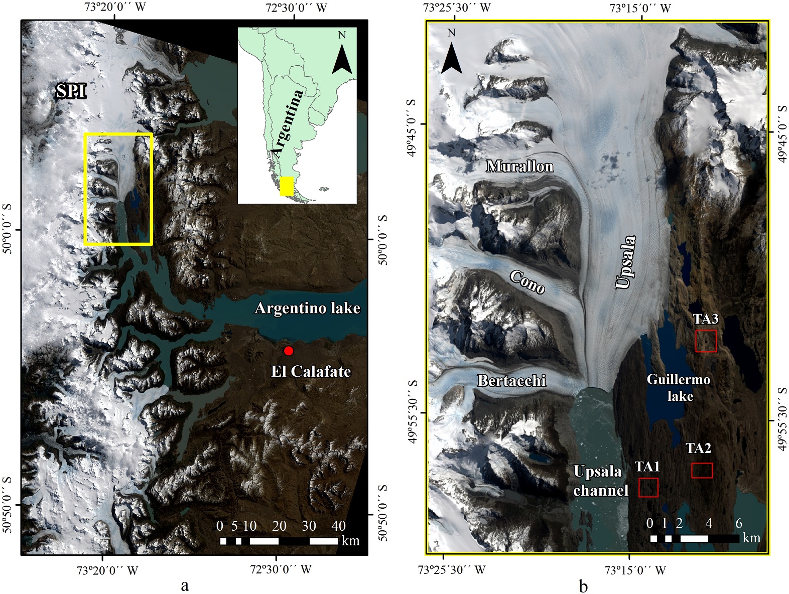 The study area is located at the eastern margin and latitudinally centered in the SPI (Fig. 1a), and encompasses the Upsala glacier tongue (49°50’- 73°15’) and its major tributaries (Bertacchi, Cono and Murallón glaciers). The main Upsala outlet glacier and the aforementioned tributaries constitute a compound basin with an area of 838 km2 (calculated from Landsat satellite images, November 2016). The main (western) glacier tongue calves into Argentino Lake and a secondary (eastern) tongue discharges in the Guillermo proglacial lake (Fig. 1b) (Skvarca, 2002).