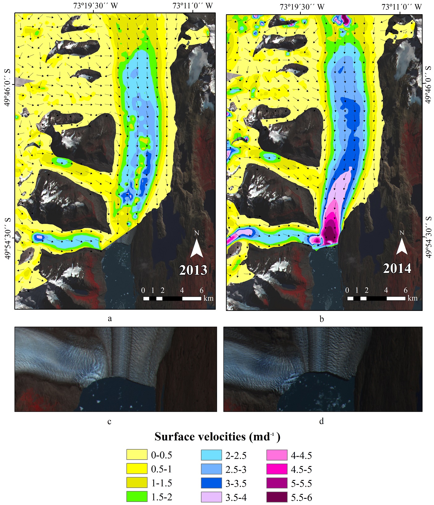 Considering the entire Upsala basin as a whole, glacier ice presents surface velocities with a range of 0.22 to 2.93±0.06 md-1 in 2013 (Fig. 3a), and reached values of 0.12 to 5.8±0.1 md-1 in 2014 (Fig. 3b). The lower velocities correspond to the lateral margins of glaciers, whereas the maximum ones were always observed inthe middle part of the Upsala glacier. The pattern of glacier direction velocities corresponds to the orientation of the ice flow (Fig. 3a-b). Thus, it can be easily noted that Upsala glacier shows an increase in velocity at a faster rate in March-April 2014 (Fig. 3b) compared to January-March 2013 (Fig. 3a). Also, the main Upsala glacier flows at higher speed than any of its tributaries. The highest velocities were recorded towards the front of Upsala glacier, coinciding with the main N-S flow direction, reaching flow rates of 2.93 md-1 in 2013, where the values can be observed in a small set of pixels of the central zone of the glacier. Due to de-correlation, the flow acceleration at the glacier front cannot be valued in figure 3a. The maximum surface velocities yielded 5.8 md-1 in 2014; the area registering these values is wider than in 2013 and represents an increase of 25% from 2013 to 2014.