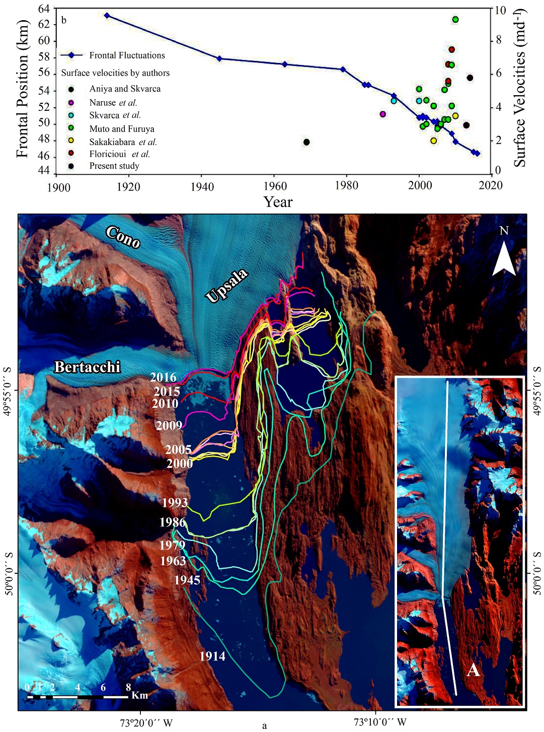 Upsala glacier is one of the temperate glaciers of high scientific interest in the SPI as it presents a combination of processes and mechanisms such as rapid frontal retreating, surface velocity variations, ablation and mass balance changes, high calving rates, thinning dynamic features, that make it a highly active glacier. From the late 20th century to the present, it had a high rate of frontal retraction and an acceleration of exceptional surface velocities, compared to other glaciers studies in the SPI.